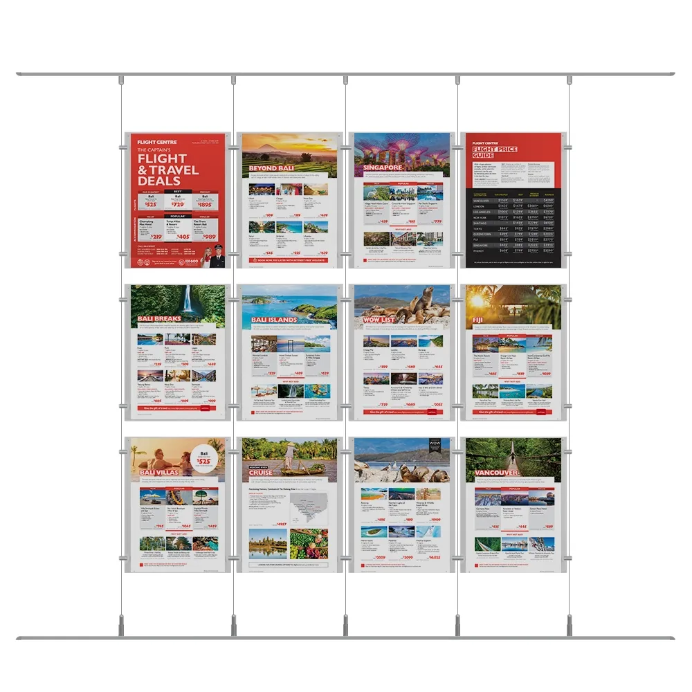 The poster hanging system, like poster cable displays, uses a rail system that makes installation easy, with fittings able to be slid into position along each of the (4) 1m long rails. There are (5) 4m long cables included that can be cut to size to fit different heights, with a minimum 1864 x 930mm space needed for the full matrix of poster frames. There are stainless steel standoffs and joiners that attach the frames to each other and the wires securely. Slimline Warehouse has same day shipping available with this and most other in stock products if purchased by 3pm EST, buy online today for fast shipping to anywhere in Australia!