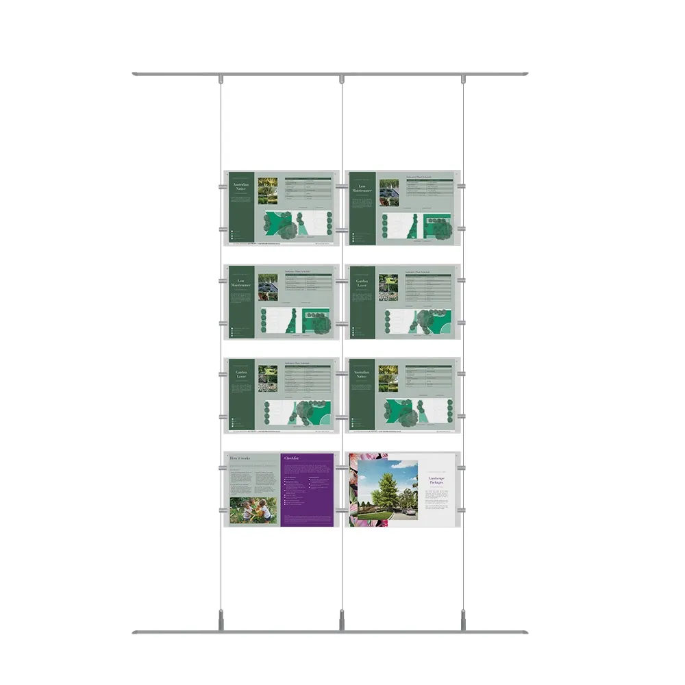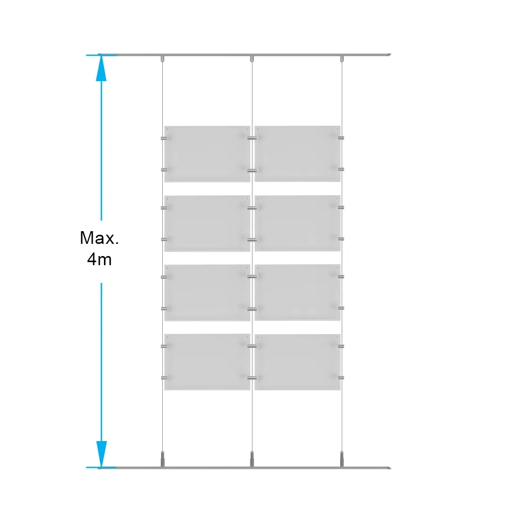 A hanging rail system helps a real estate agency, information centre, retail store, shopping centre, museum, or other location display multiple posters in an eye-catching graphic display! The 4 x 2 array features (8) poster frames made from 3mm thick clear acrylic with polished edges, offering a full view of graphics and using a 2-sided design to hold (16) total posters at once. Each frame holds an A4 (210 x 297mm) poster in landscape orientation, using a slide-in design that makes graphic changes easy in seconds with no tool necessary! The sides panels of the frames have small button magnets embedded inside to keep the holder shut and prevent posters from moving out of position.