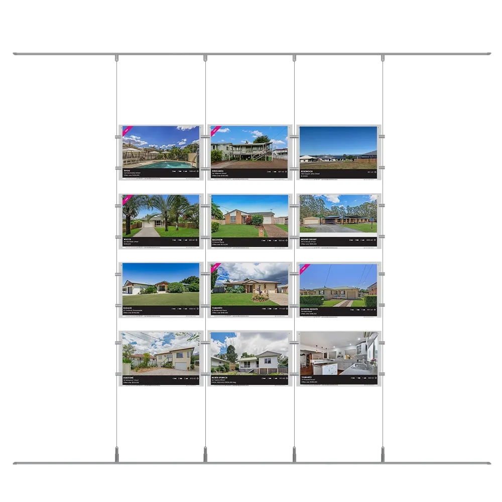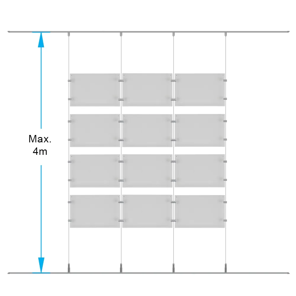 The picture hanging rails, like cable poster systems, use (4) 4m long steel cables to suspend the poster frames in the air and are able to be cut to size to fit most floor to ceiling distances. The full 4 x 3 array needs a minimum 2000 x 885mm space for full assembly, with the (4) 1m long aluminium rails going all the floor and ceiling to make installation easy, with fittings sliding into place to position the wires. Standoffs and joiners use an edge grip to fasten the frames to each other and the wires securely.