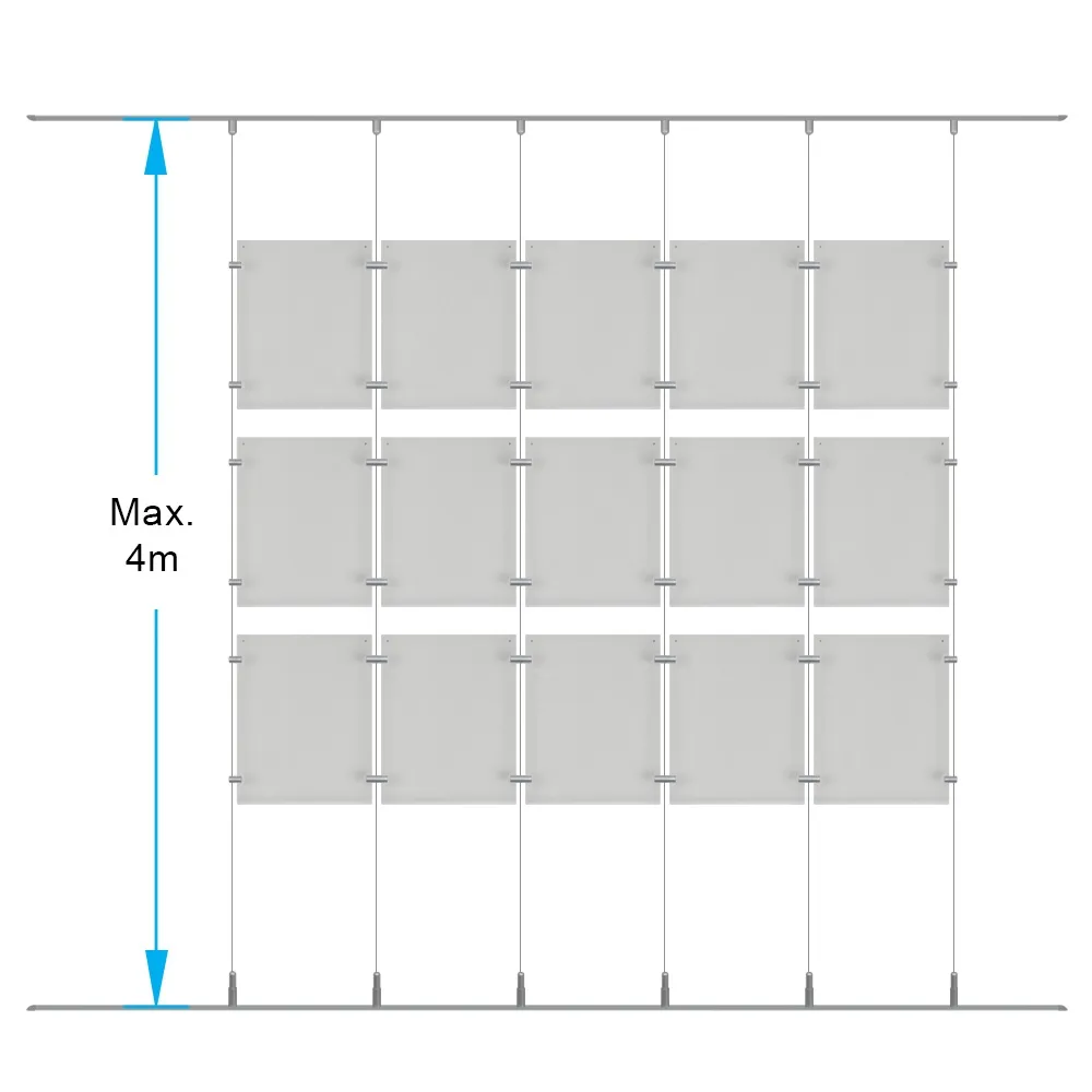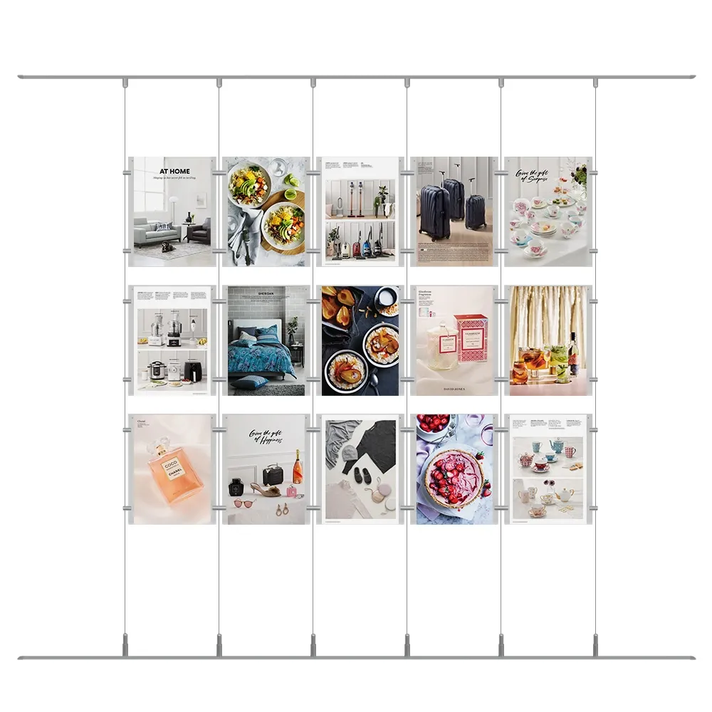 Window cable displays feature a 3 x 5 array of poster frames that is greatly suited to retail stores, museums, real estate agencies, information centres, travel agencies, and more! There are (15) poster frames that are each dual-sided to display a total of (30) graphics at the same time, with the kit typically being used in storefront windows to reach people inside and outside your location at the same time. The frames displays A4 (210 x 297mm) graphics that are in portrait orientation and have a slide-in design that makes switching out graphics in seconds easy with no tools needed. There are small button magnets embedded within each side as well that keep the panels shut during use and help keep graphics in position.