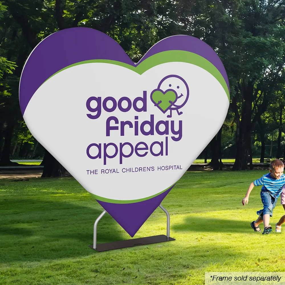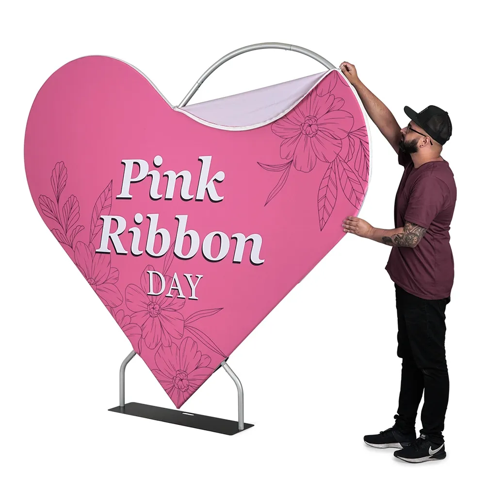 Update the graphics for your heart-shaped popup stand with this replacement fabric wrap! Your custom designs are digitally printed in full colour using a dye-sublimation process that places imagery directly onto the fabric for richer colours and vivid imagery that are less prone to fade over time. This graphic is meant for HSAPRTDSKIT2 popup exhibition stands with a unique heart-shape that is perfect for photo shoots, weddings, trade shows, hotels, casinos, and more. The wrap is made from stretch polyester fabric that tightly grips the frame and is machine washable to make cleaning in between uses a simple task. A zipper on the wrap makes attaching it the frame quickly easy and makes the fabric taut around it. Slimline Warehouse offers fast shipping to anywhere in Australia. Buy online today for quick dispatch to Melbourne, Perth, Sydney, Canberra, Adelaide, Brisbane, and anywhere else nationwide!