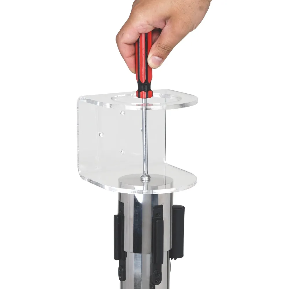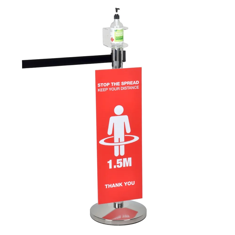 This stanchion sanitiser bottle holder helps turn any barrier post into a sanitising station, able to provide different cleaning options to help maintain hygiene in any location! Using a sanitising station stand in your location is best to help stop the spread of germs, and is important in banks, retail stores, cafes, information centres, transit hubs, restaurants, grocery stores, shopping centres, and more. This holder is made from black acrylic on a silver barrier topper, a stylish look that works well with a wide variety of barrier post styles and retractable belt colours. The unit doesn't restrict access to the retractable belt or the receiving clips once securely in place either, ensuring you can still manage a queue or cordon off an area effectively.