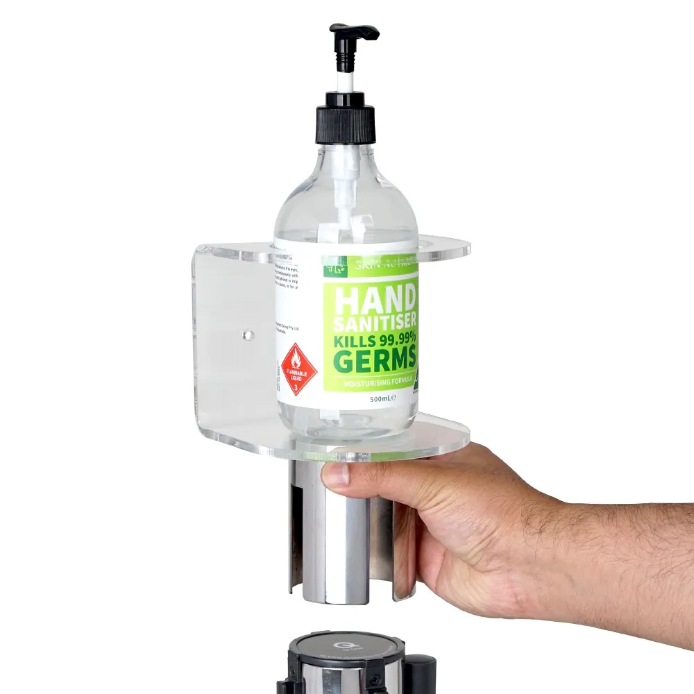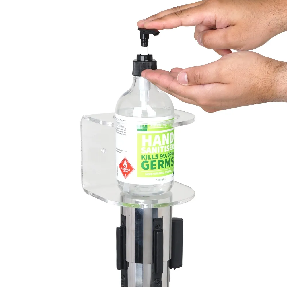 - Stanchion sanitiser bottle holder fits atop barrier posts to create a disinfectant station