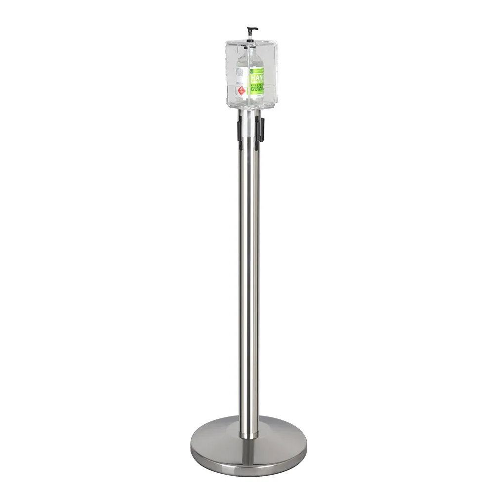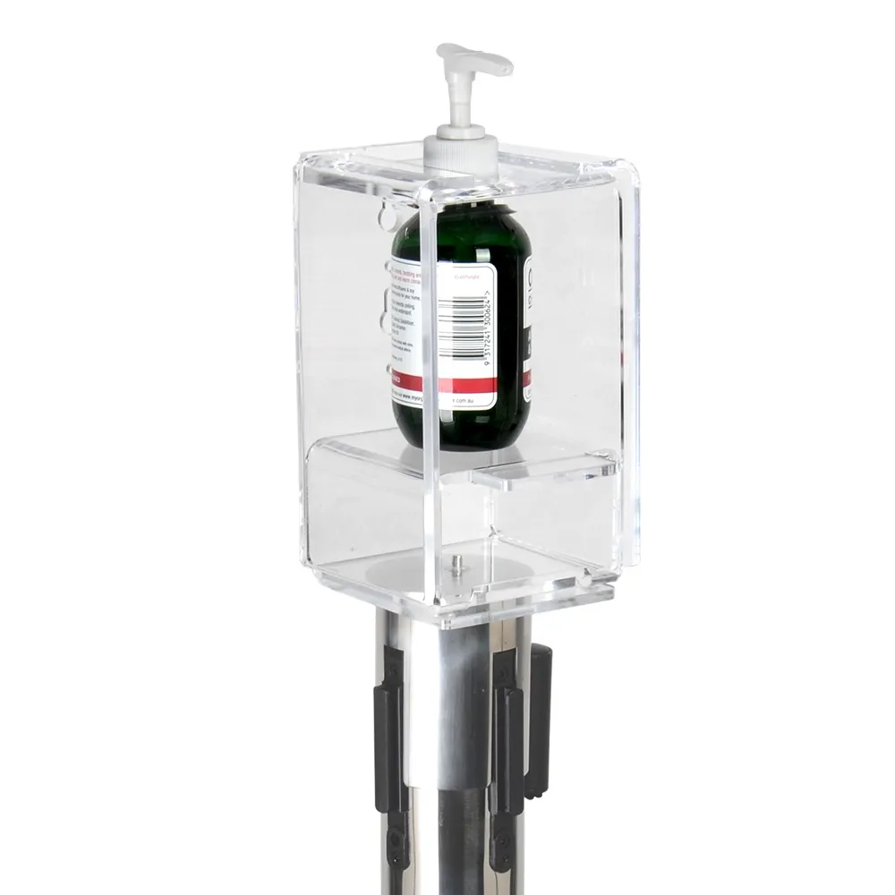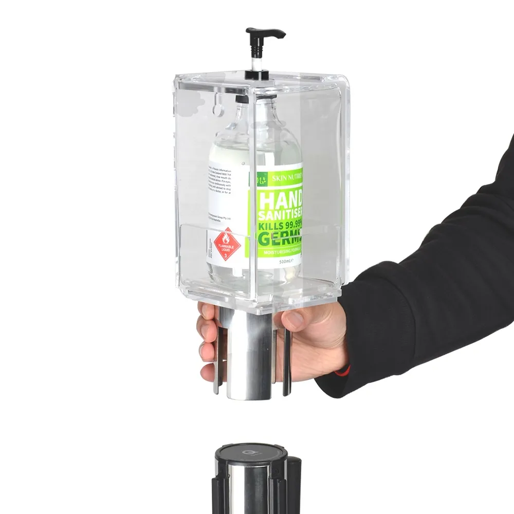 This sanitiser station for stanchion makes it easy to provide sanitising gel to people waiting in a queue to help prevent the spread of germs! Having sanitising stations around your retail store, bank, grocery store, library, cafes, airports, and more help promote good hygiene without being obtrusive in its installation. The sanitizer gel holder is designed to work with a wide range of different barrier post types, easily fitting atop the post without any tools necessary for secure attachment. The retractable belt and receiving clips are still accessible to ensure that connecting belts to manage a queue or section off an area isn't impacted.