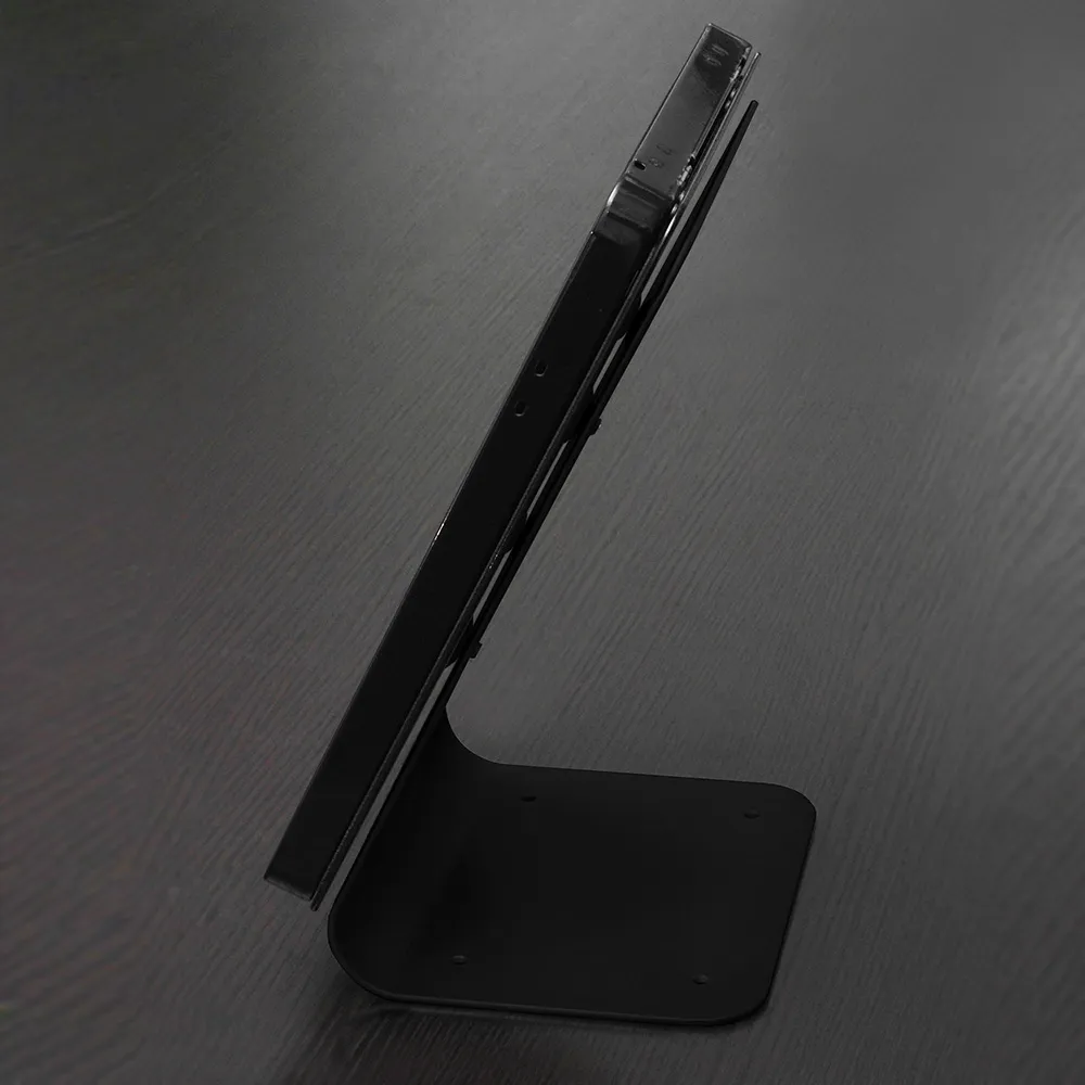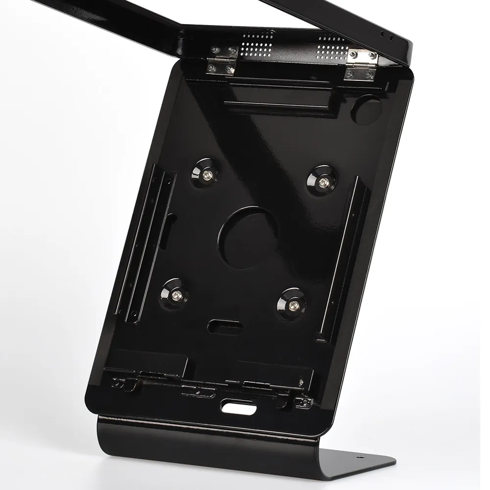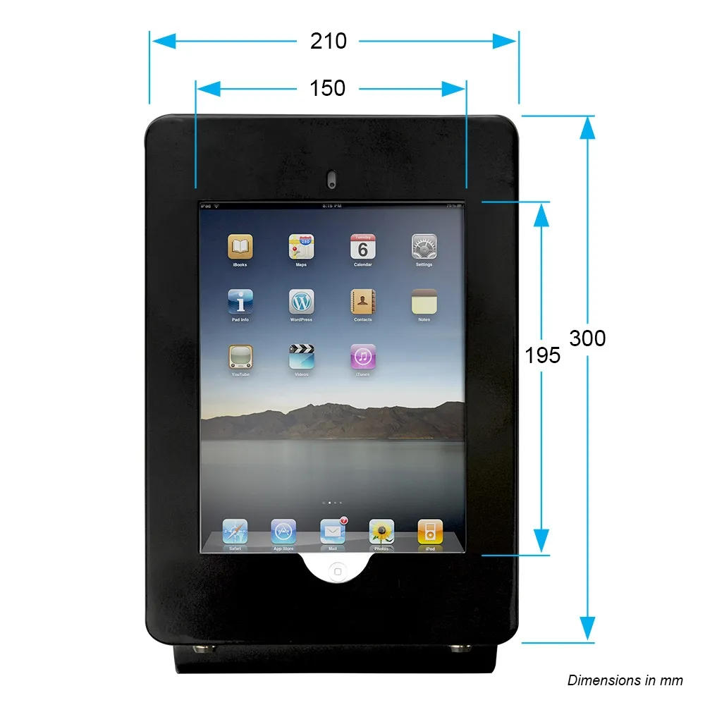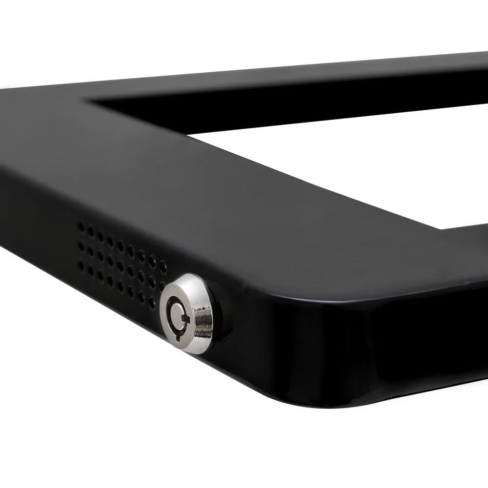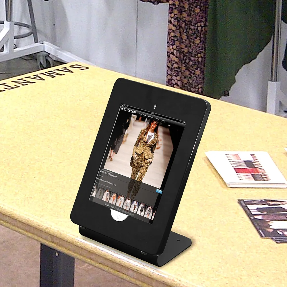 The secure tablet mount, also known as iPad enclosures and a desk stand holder, is made of steel in order to provide a durable display that is able to be placed in heavily-trafficked areas for years to come. Featuring a black finish, this stand is able to blend in well with any décor, offering a stylish look that helps to draw the attention of passersby.