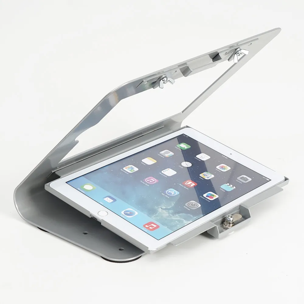 This tablet holder with lock provides a secure mount for retail stores, cafes, waiting rooms, exhibition halls, hotels, shopping centres, and more to check-in guests, advertise sales, and provide interactive promotions! The iPad display stand is a versatile unit, able to be mounted on both walls and counter tops to fulfill the needs of differing locations without issue. The front face of the iPad holder is angled to make viewing the screen easy as well as inputting information and using launched Apps.