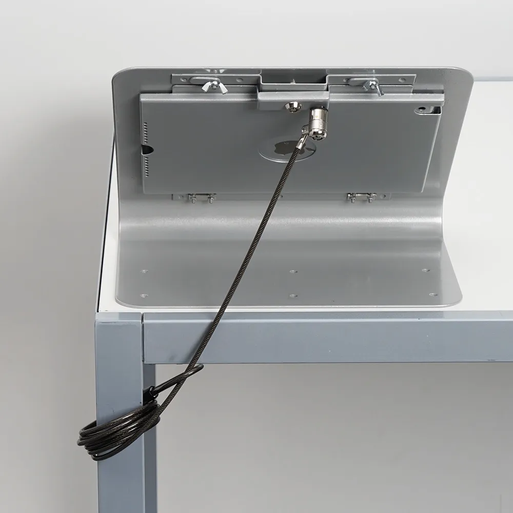 The secure iPad mount, tablet holder with lock is a secure displayed designed for use in public areas with effective theft protection on the display. The iPad is secured within the steel frame with a lock on the back with the key included. Additionally, there is a slot to attach a cable lock to the mount to secure the entire holder to a wall or table for additional security. This display holds Apple® iPad 10.2", working with 7th (2019), 8th (2020), and 9th (2021) generation devices displayed in landscape orientation. The home button is exposed as well to allow additional interactions.