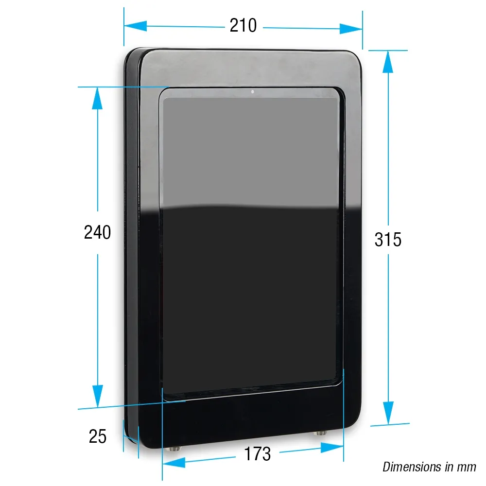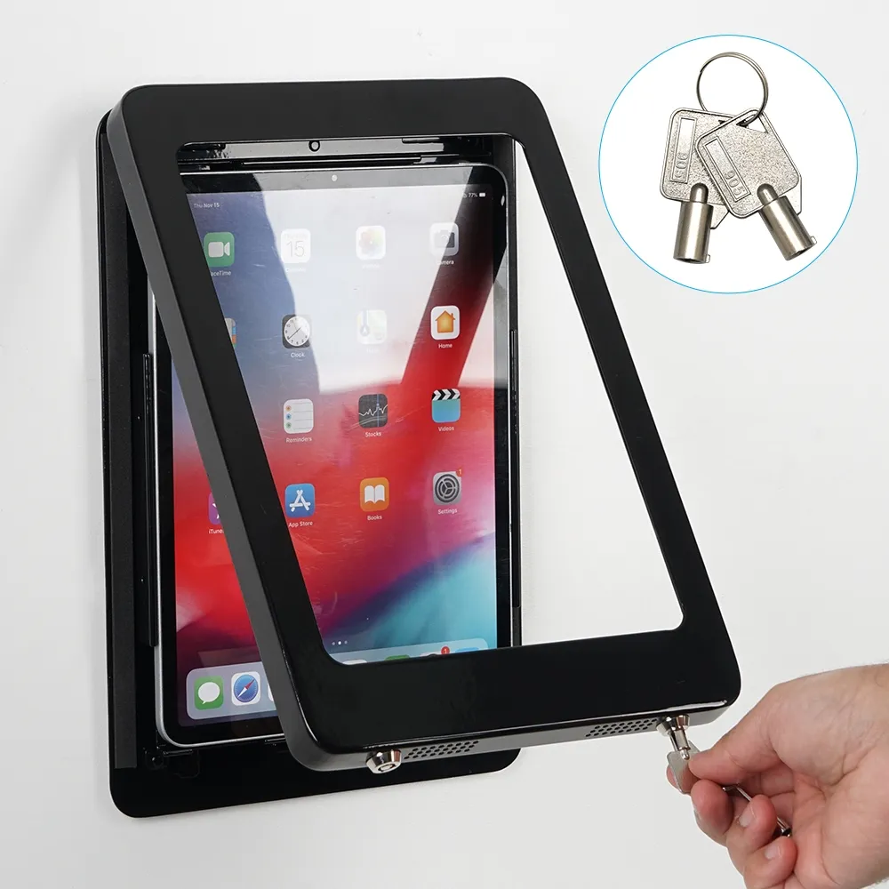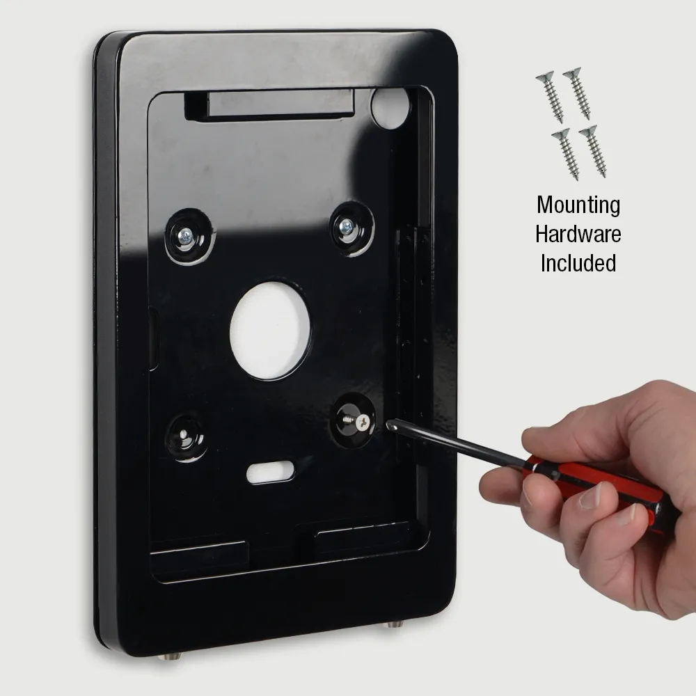 A wall mounted iPad pro, like a tablet holder, can be used with different tablet models for better compatibility. Display Apple® iPad Pro 11” (1st, 2nd, 3rd, and 4th generations / M4 and M5) or Apple iPad Air (4th, 5th/ M2, M3) and iPad (10th / 11st generations) models in this unit safely. Mount the unit in either landscape or portrait format depending on your location needs, with both orientations have the same safety and security. There are small air hole cut-outs on the top and bottom that provide airflow to keep the device cool and allow any audio playing from the speakers to be heard. This style of mount is great for retail stores, doctor offices, reception areas, sporting arenas, trade show halls, information centres, museums, and more.