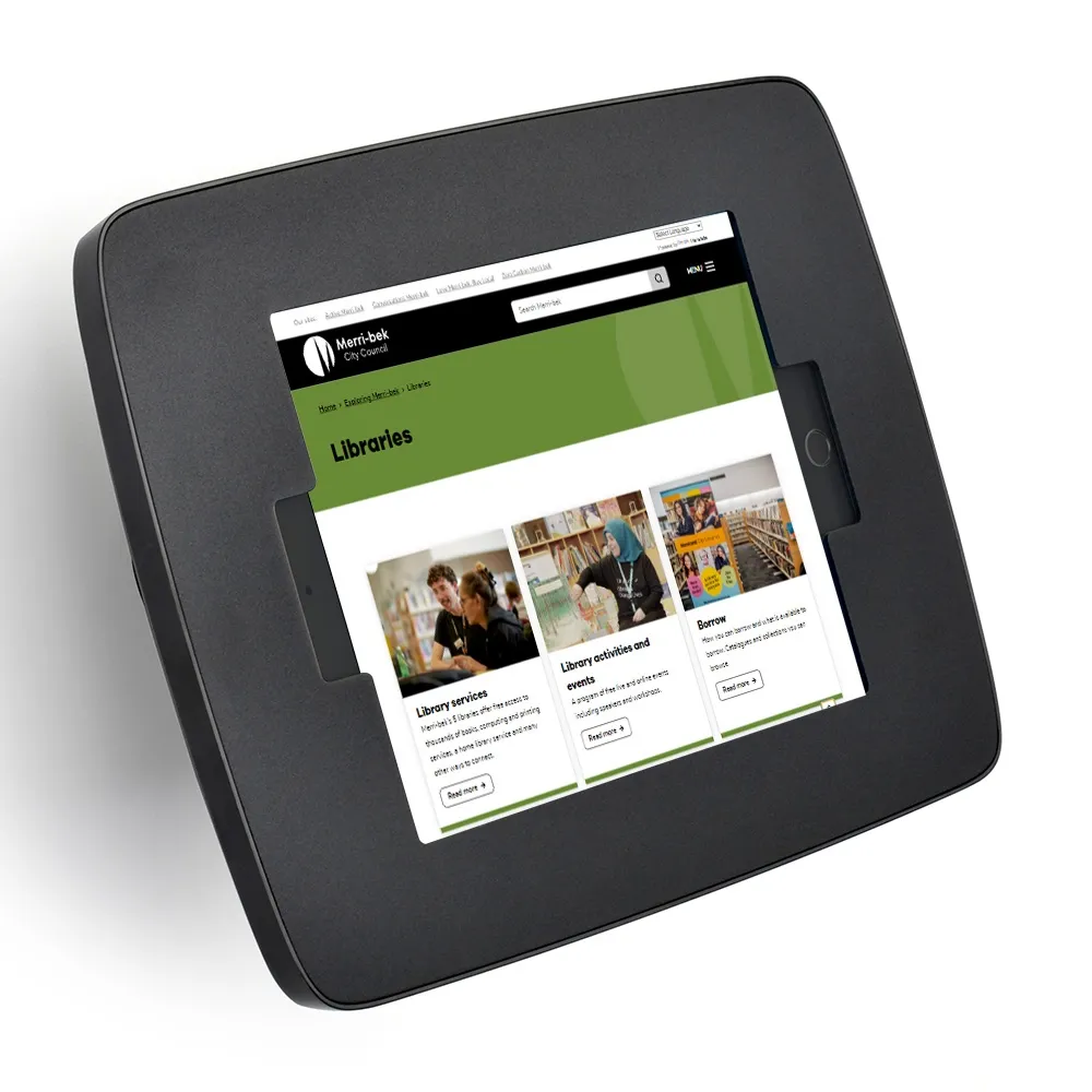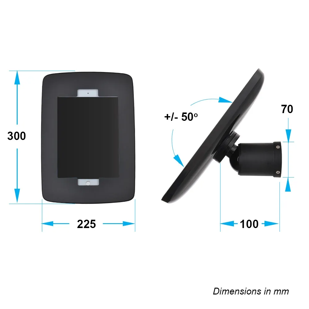 Use this iPad 10.9 wall mount, like other mounted tablet displays, to securely have the latest technology at your location with little worry of theft. The security tablet has a locking design to allow for use in public areas. The entire holder is on a swivel mount, rotating 360° to allow different angles for viewing as well as display in portrait or landscape orientation. There is internal cable management to keep the power cord hidden within the frame to maintain a professional appearance in all locations whilst ensuring power to the tablet. This mounted display protrudes from the wall 100mm and the front cover is 300 x 225mm.
