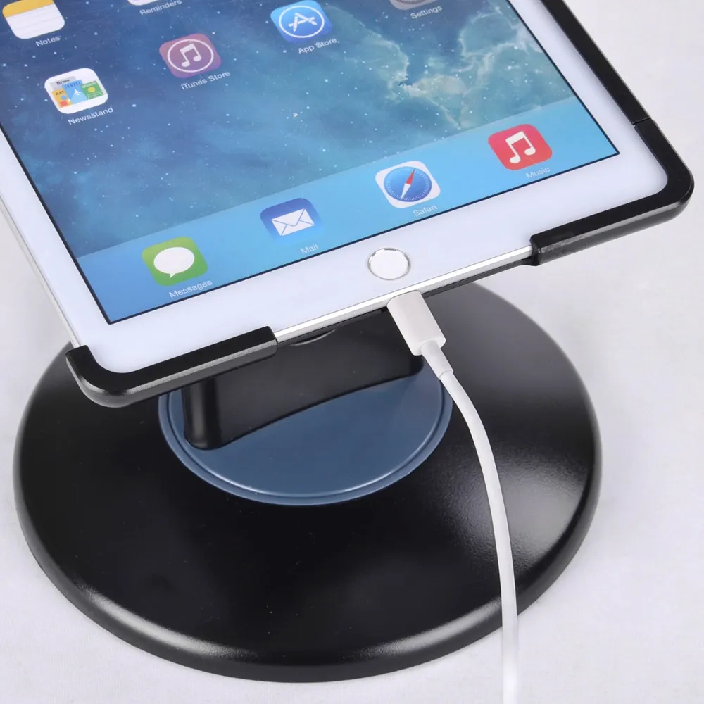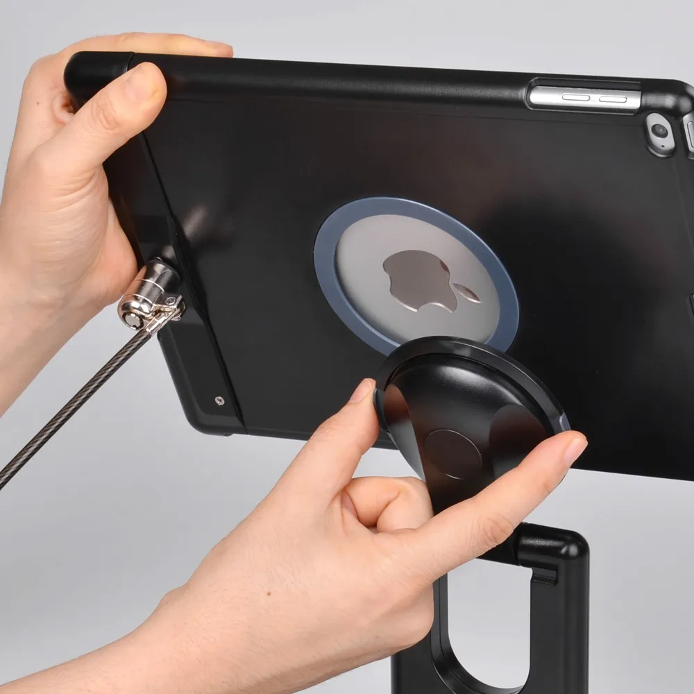 This Apple tablet holder, iPad mount is a fully adjustable display, able to be angled and tilted in any direction in order to easily be used by employees and patrons alike. The secure display helps to prevent theft by keeping your tablet securely attached to the surface the base is on using a Kensington lock. This lock allows the tablet to be removed from the stand if necessary for use without fear of theft.