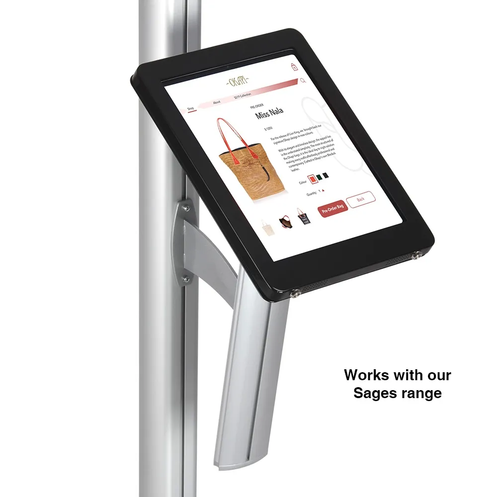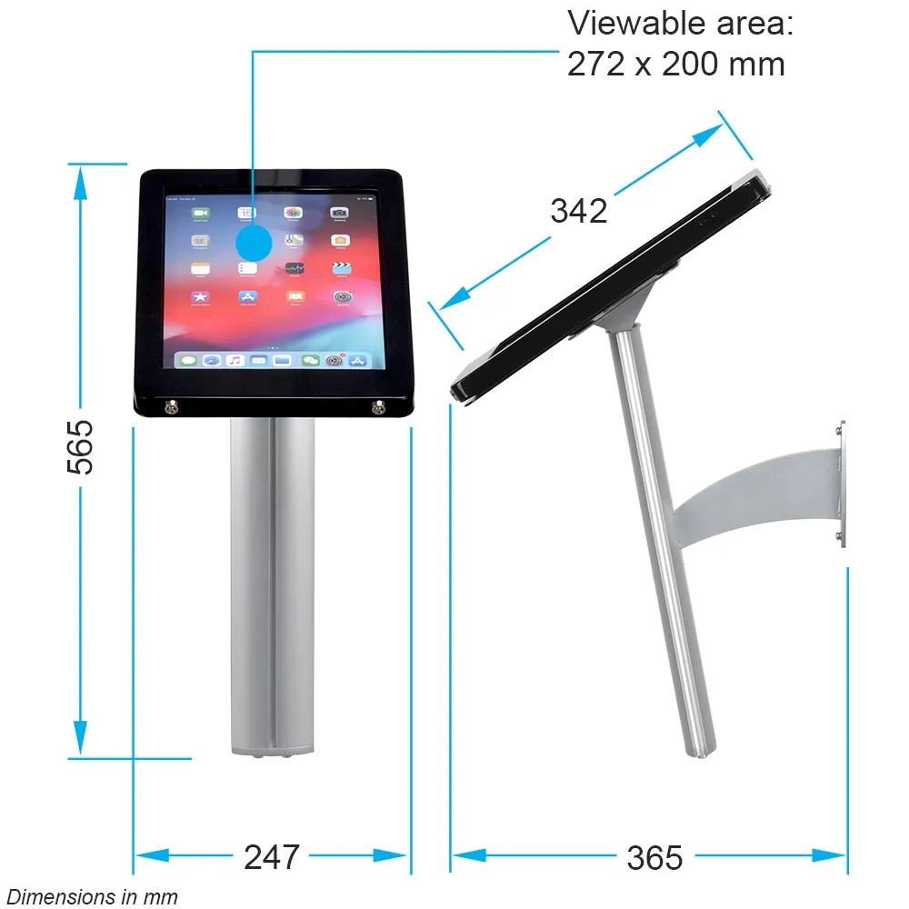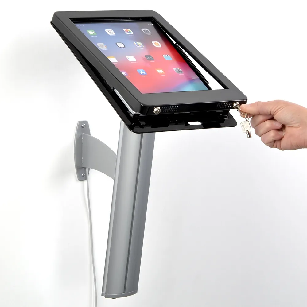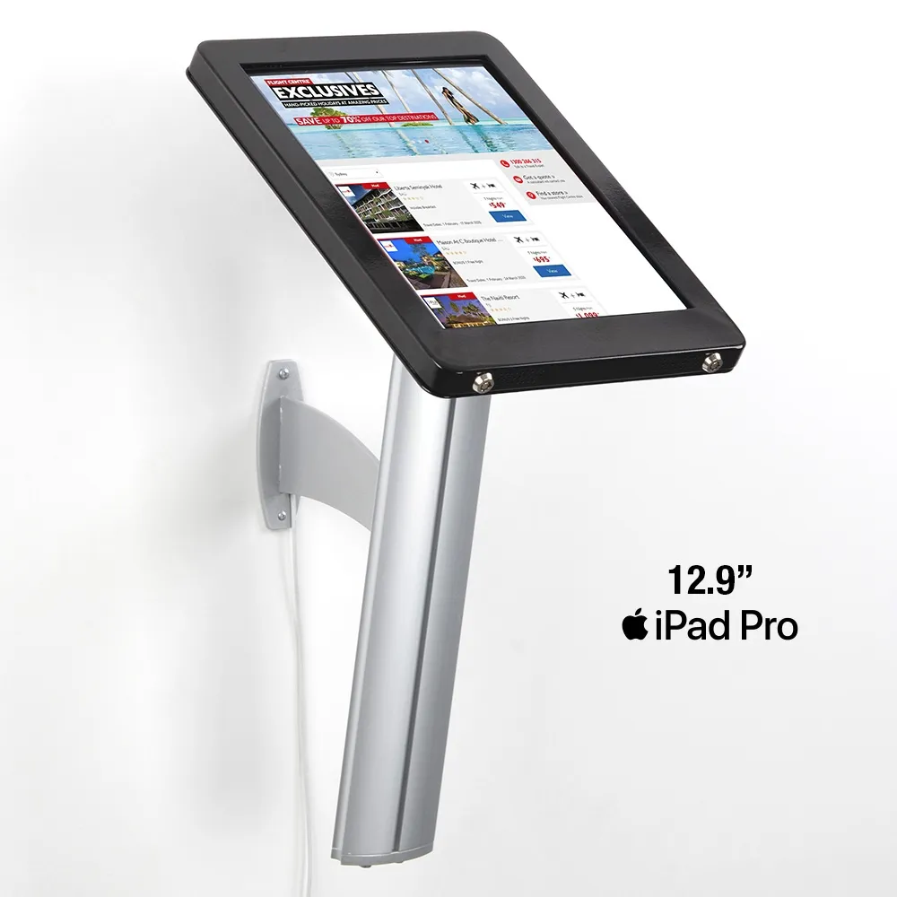 This 12.9 iPad mount is a wall bracket that holds Apple tablets to provide information or assistance to visitors at museums, art galleries, transportation hubs, retail stores, shopping centres, and more! The wall mounted iPad holder is designed to hold iPad Pro 12.9", able to be displayed in both portrait and landscape formats depending on your needs. The holder rests upon an angled arm, tilting the screen towards users for a better experience when viewing and interacting with the tablet! The arm can be adjusted along the wall mount to set the height that is most appropriate for those using the tablet.