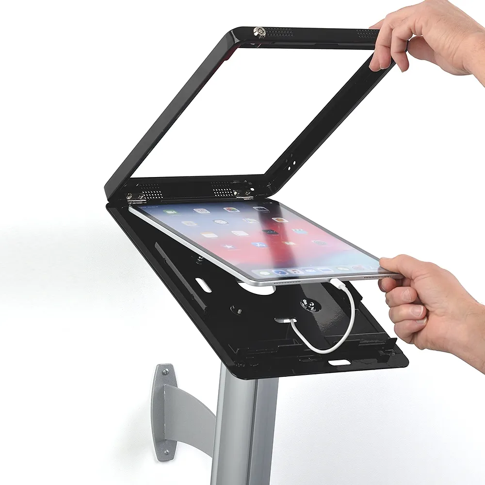 The 12.9 iPad mount, one of many available Apple tablet holders, is a lockable display that provides a secure way of offering the benefits of the tablet in public spaces with little worry of theft. There are (2) locks on the bottom that allow key holders access to the interior. The home button is also covered with this holder to prevent unwanted access to all the Apps and settings on the tablet. There are holes in the bottom for the speaker as well to allow sounds to be heard, with a pin hole for camera usage as well.