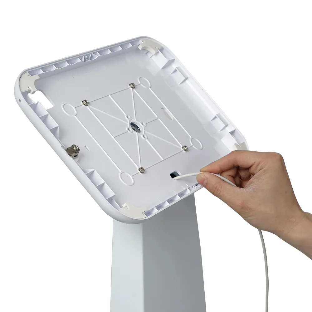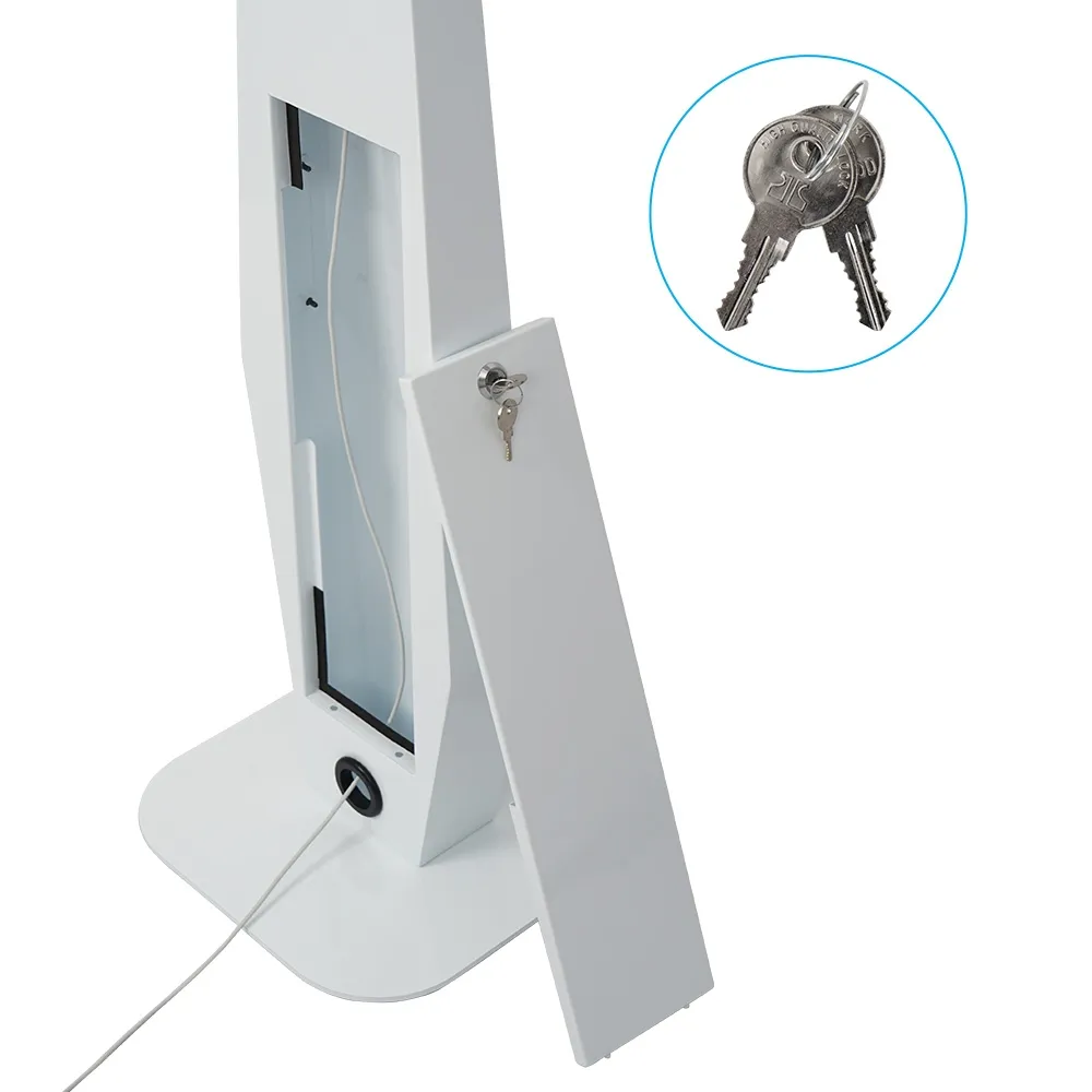 This iPad 10.2 inch stand, like other lockable tablet kiosks, has the home button covered to prevent users from accessing the entire display and keep them on your loaded app. The front facing camera is uncovered for not only facial ID but also to allow interactive experiences depending on how your app is set up. This stand is a lockable display with the Apple tablet safe within the mount to allow use in public areas whilst deterring theft. The rear of the display has a locking cabinet, with items able to be stored in the 180 x 570 x 60mm space. This fixture has internal cable management, with the power cord not seen whilst it's connected as it goes through the center column of the stand and exits through a hole on the rear.