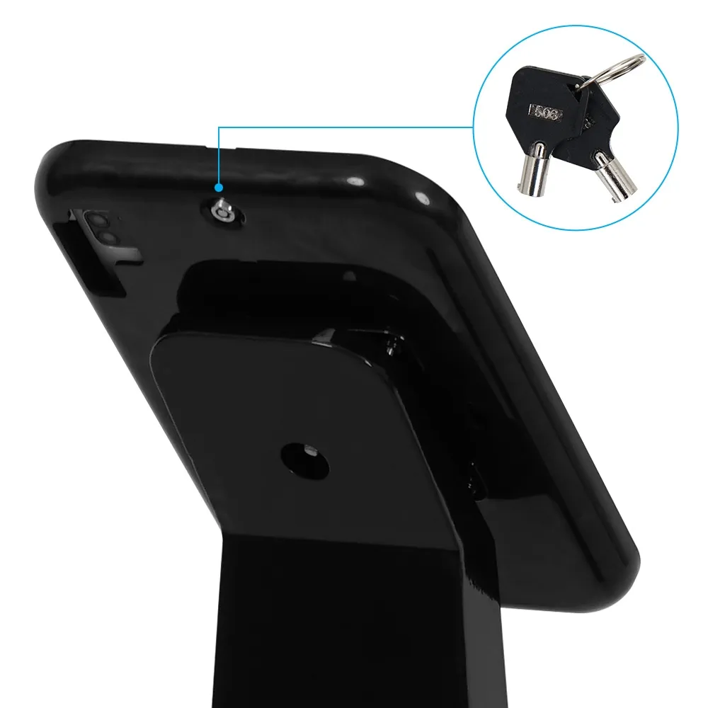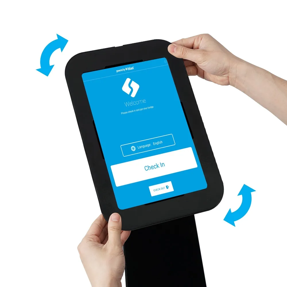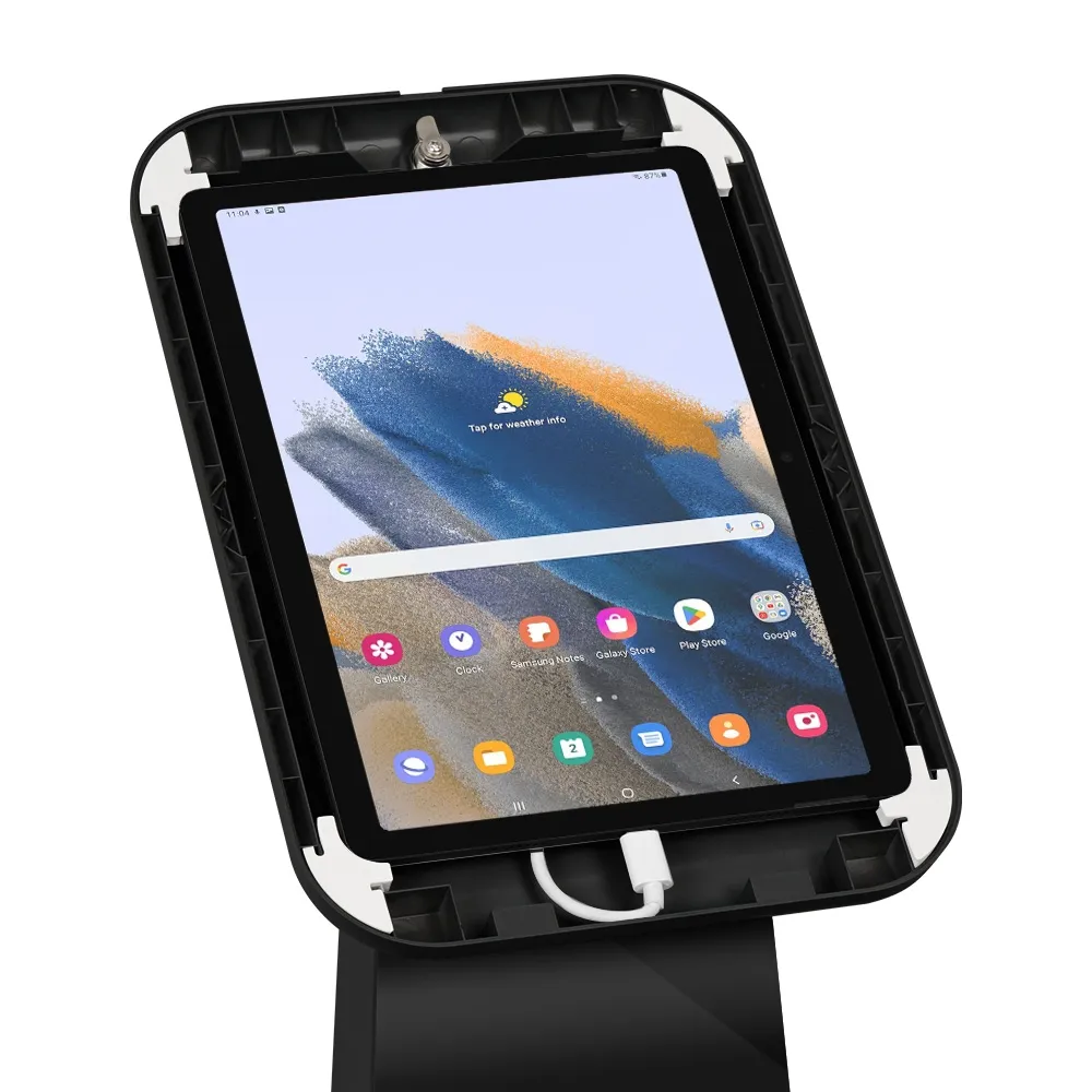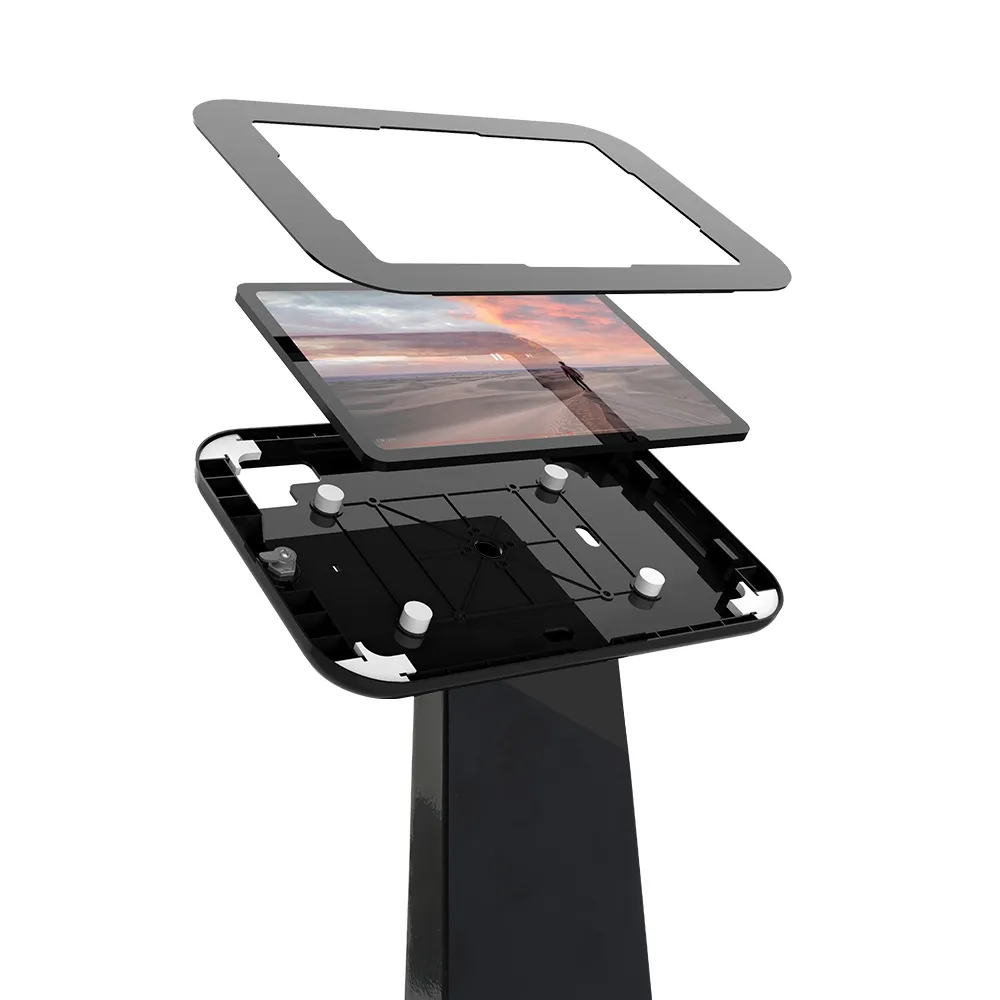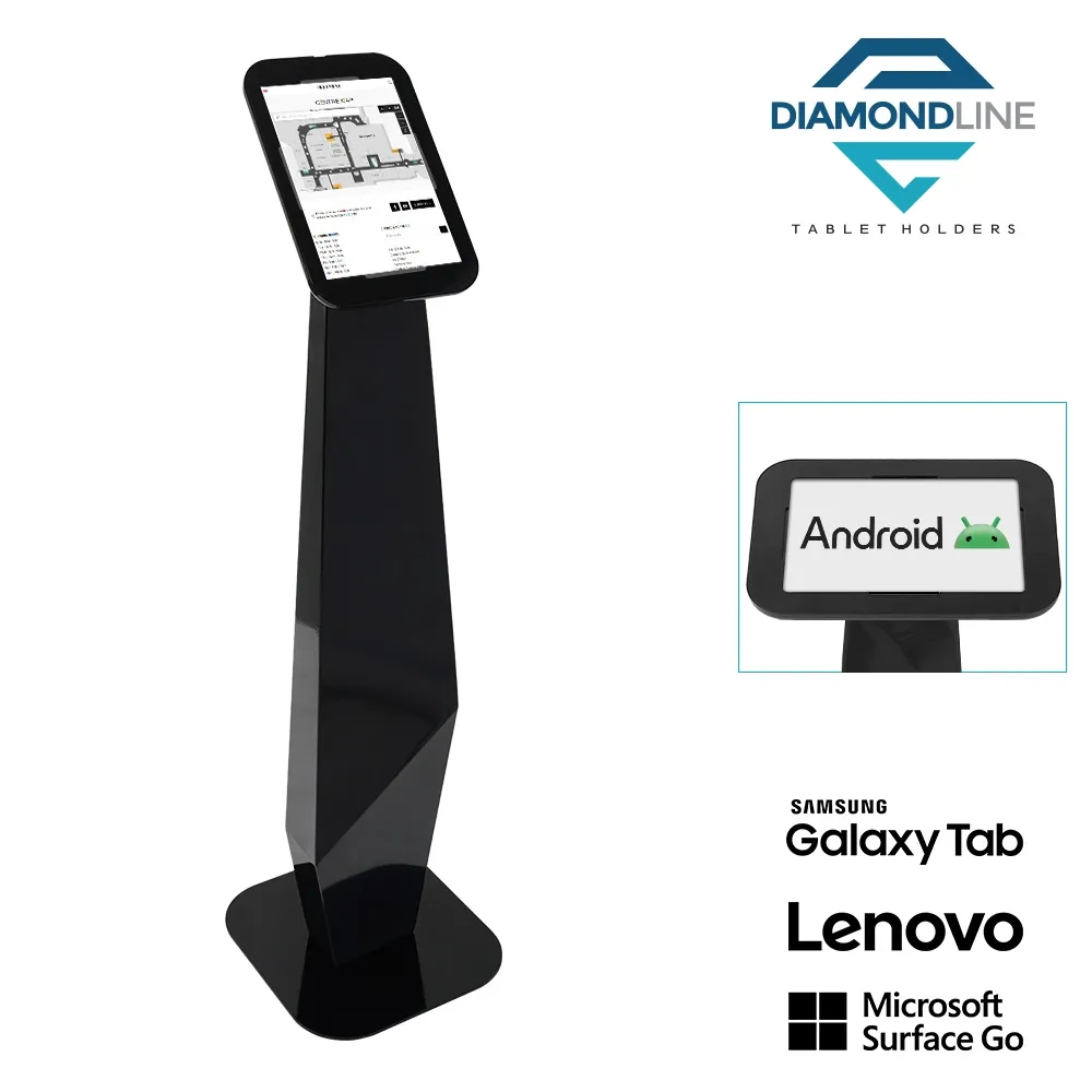 This floor standing tablet holder makes it easy to have a device or customers or visitors to use anywhere at your location. This stand features a versatile mount that can display your device in either landscape or portrait format in order to keep your App in the right orientation. The bracket is designed to hold many non-iPad devices, including most Samsung Galaxy, Lenovo, and Microsoft Surface Go tablet models. No matter which device you use, the camera is exposed to allow for both facial ID and additional interactions.