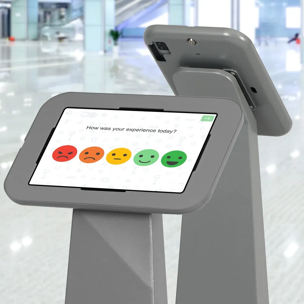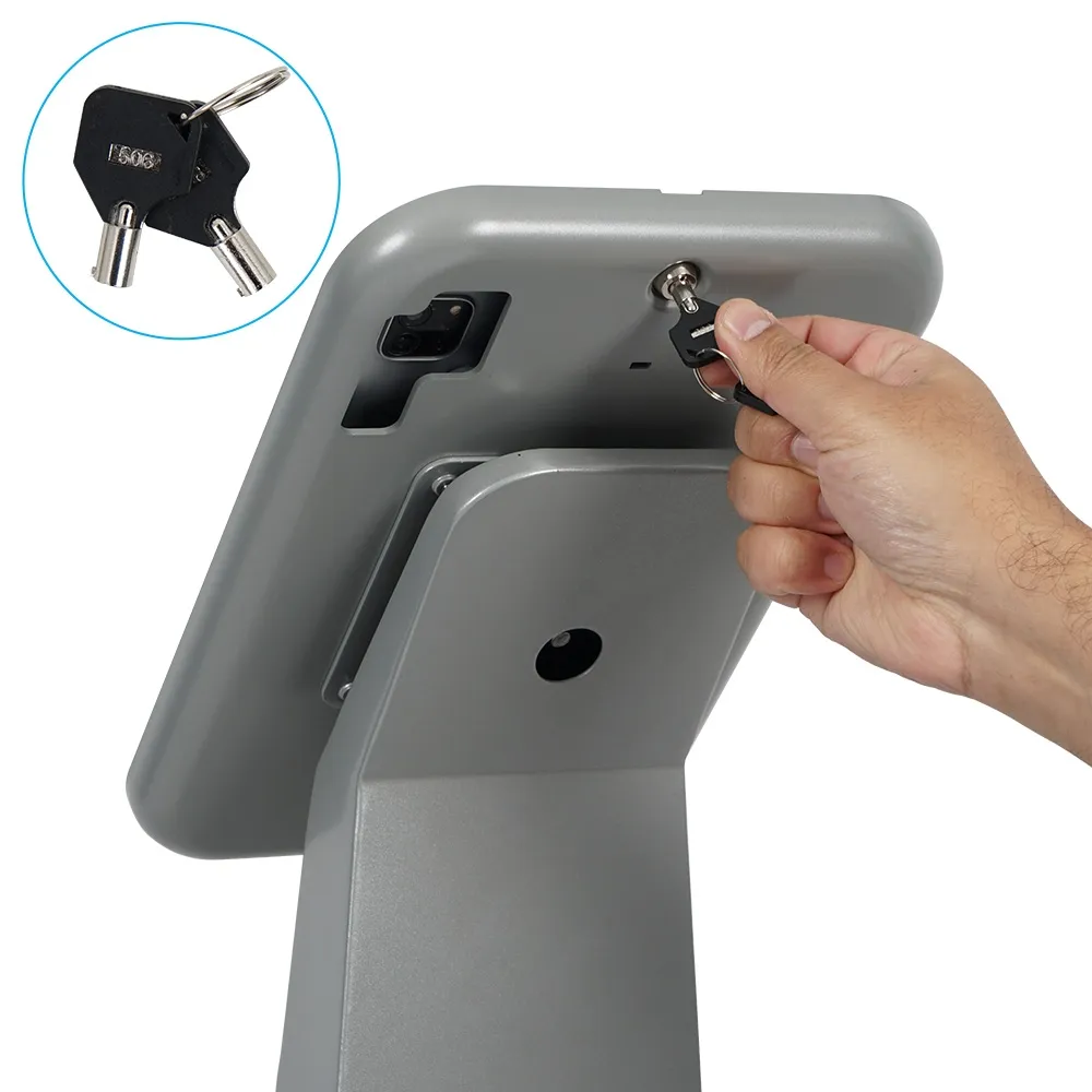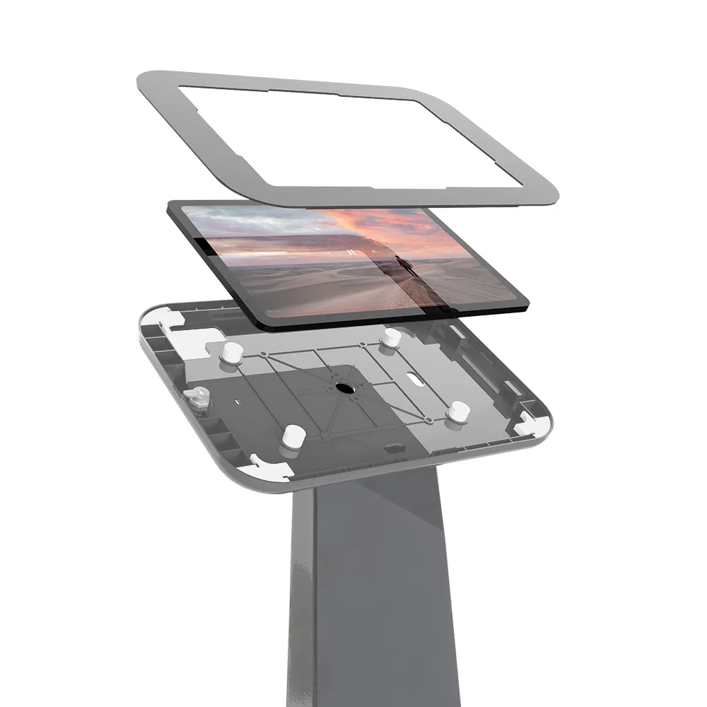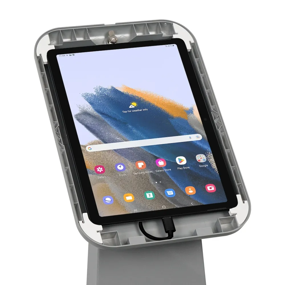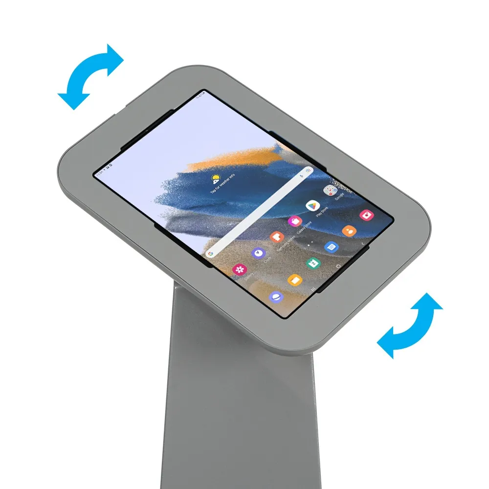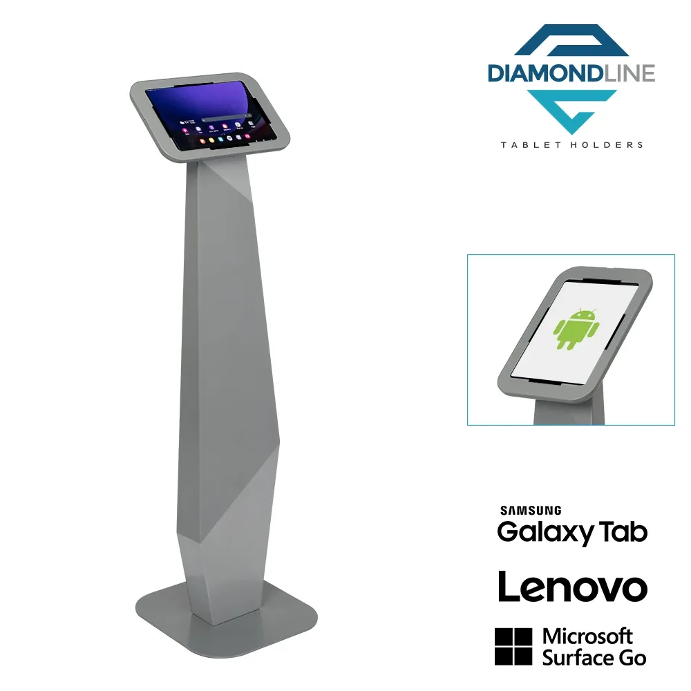 In search of a floor tablet holder for use at your retail store, shopping center, museum, exhibition hall, art gallery, or other location? This versatile display holds an array of non-Apple devices to allow any business to provide an interactive experience to their visitors. This universal holder is designed to hold many non-iPad devices, including most Samsung Galaxy, Lenovo, and Microsoft Surface Go tablet models. Each device can be placed in portrait or landscape orientation, a versatile display that allows Apps to be displayed as intended. The camera is exposed on each device so that facial ID or other interactive features can be utilised.