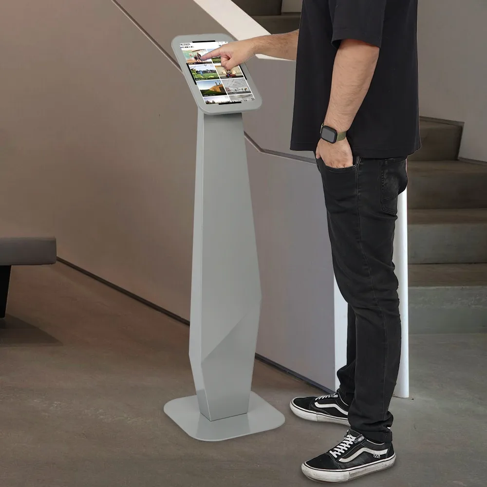 - Floor tablet holder is 1200mm tall with unique geometric design