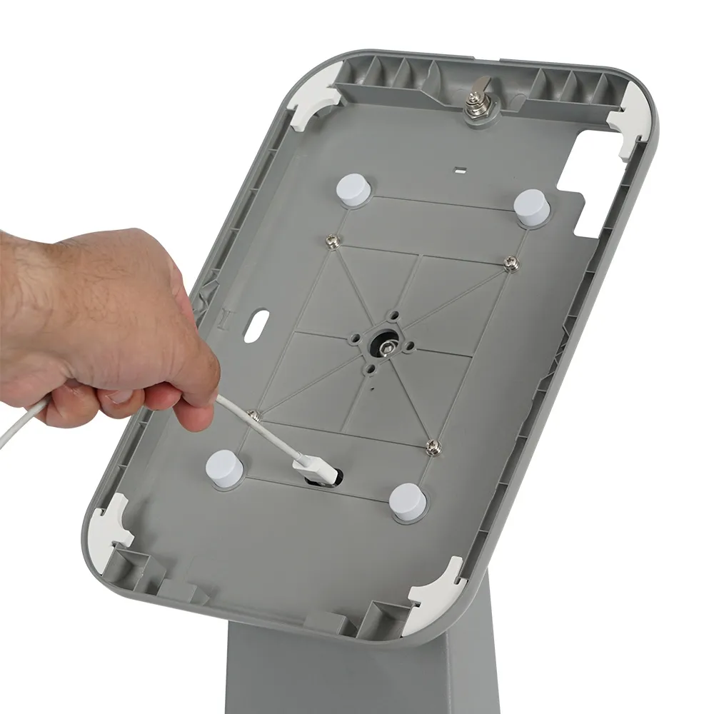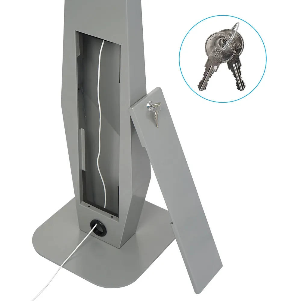 This floor tablet holder, like many secure iPad stands, features a lockable design to help deter that when used in public spaces. There is a Kensington lock slot on the rear of the mount to secure the entire display at your location for additional security. The 1200mm tall stand features an angled front face to make utilising the tablet easy. A small storage area in the interior column is accessible from a locking door on the rear. Internal cable management as the power cable goes through the centre column of the unit in order to provide a tidy look.
