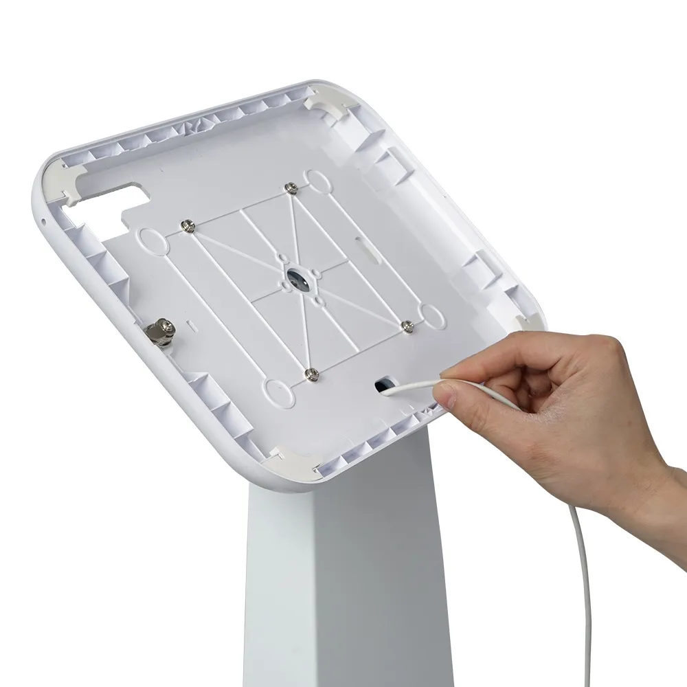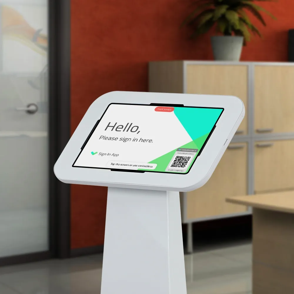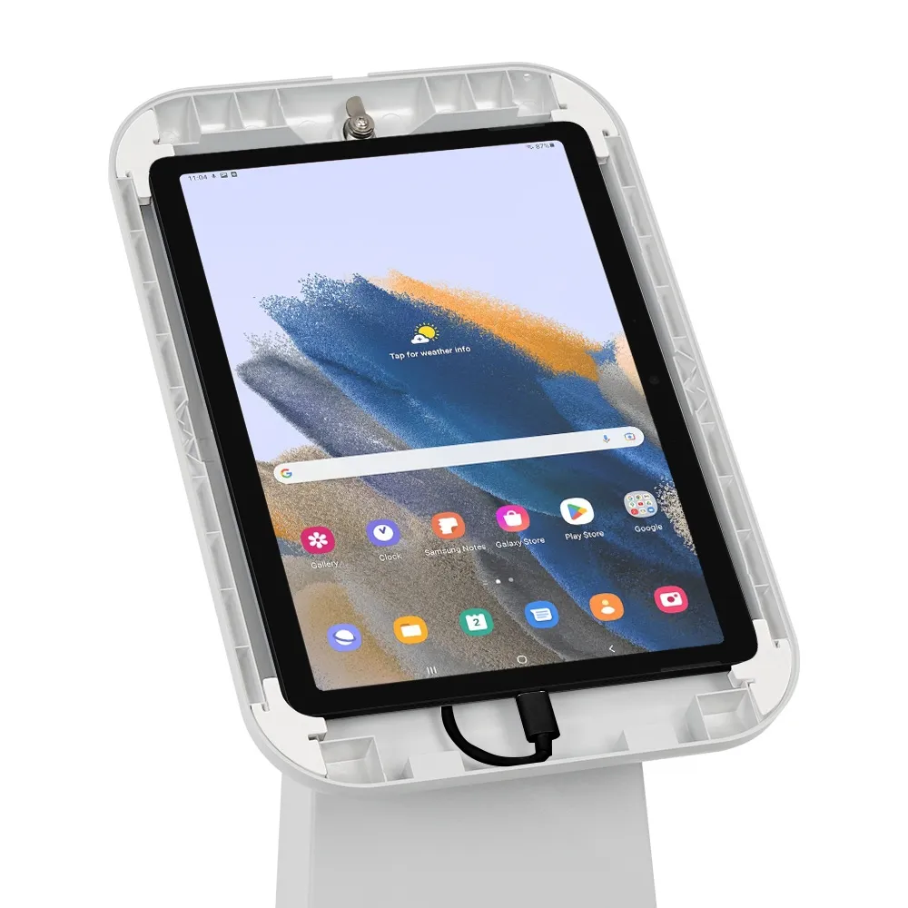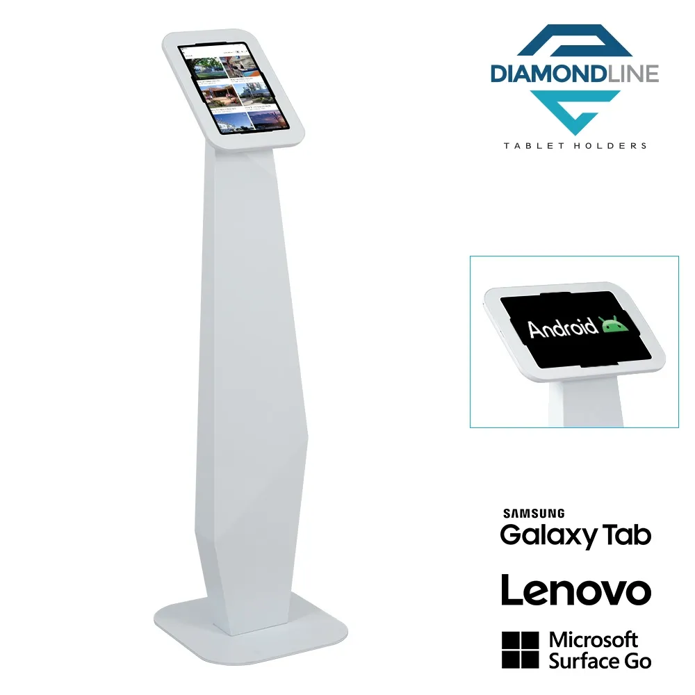 This tablet floor mount is a versatile unit that allows for devices to be utilised to check in visitors, offer promotional information, display product specifications, and more! This unit is designed to hold many non-iPad devices, including most Samsung Galaxy, Lenovo, and Microsoft Surface Go tablet models. Each device can be placed in portrait or landscape orientation to allow your App to be shown properly, great for use in any location. The camera is exposed on every device to allow for interactive experiences as well as provide facial ID if necessary.