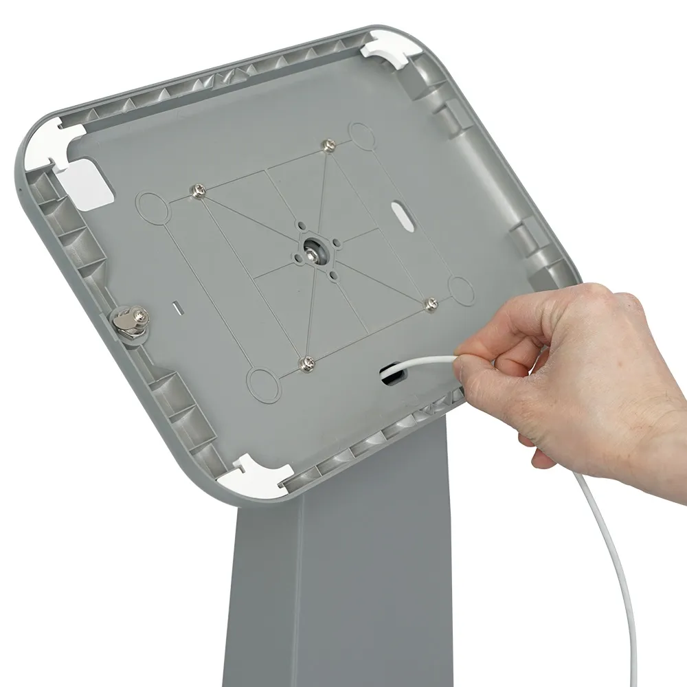 This locking tablet kiosk, silver iPad stand leaves the camera exposed to allow for facial recognition or for use as an interactive display for your visitors. To allow peace of mind when in use of public spaces, this entire display is lockable to help deter theft. The rear of the display has a locking cabinet that offers 180 x 570 x 60mm of storage to keep what you need with the device. Internal cable management threads the power cable for your tablet through the center column and out a hole in the back to maintain a professional appearance.