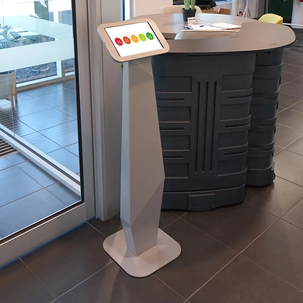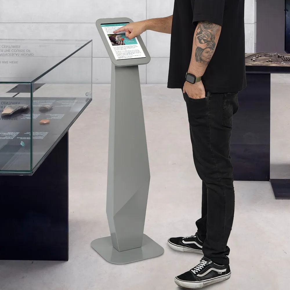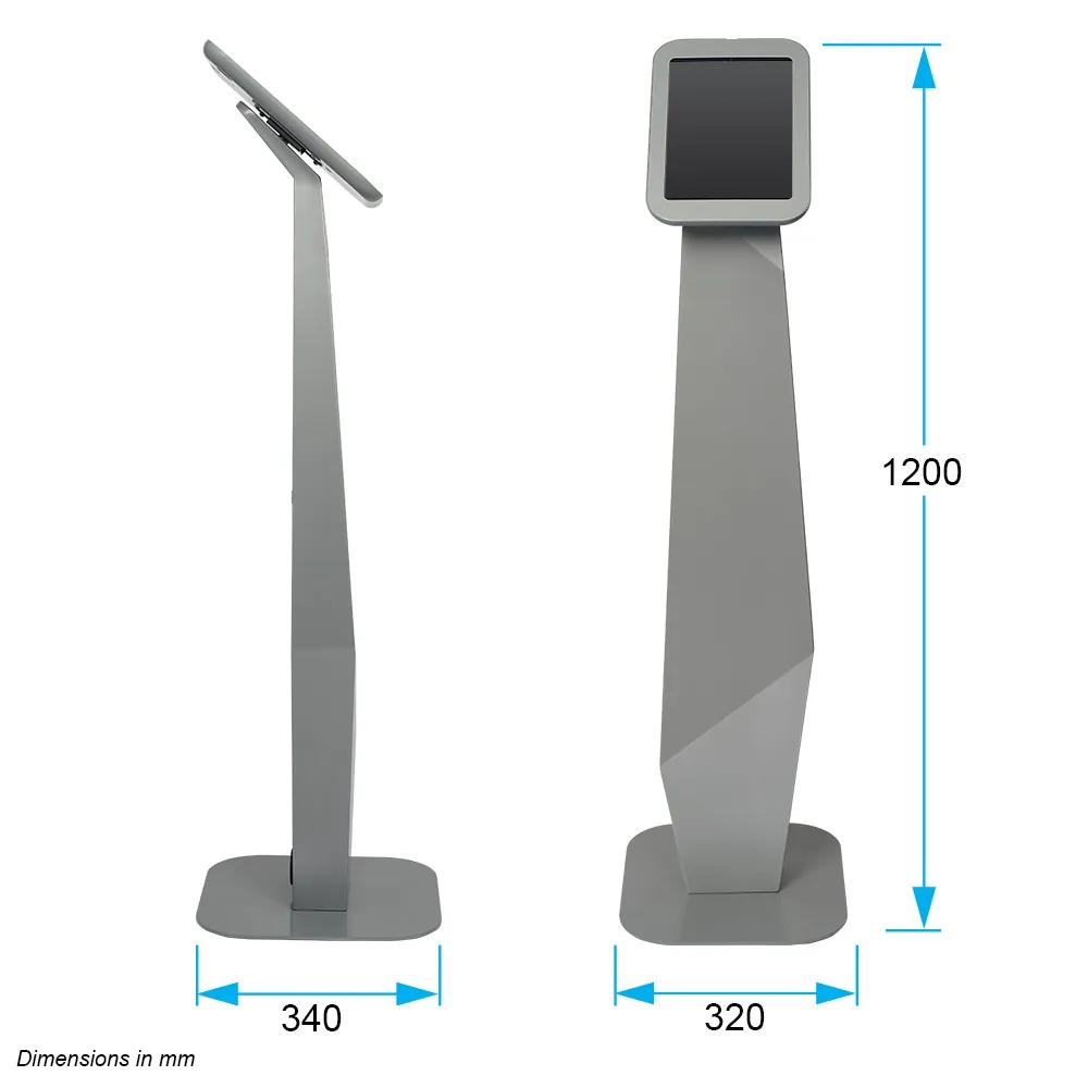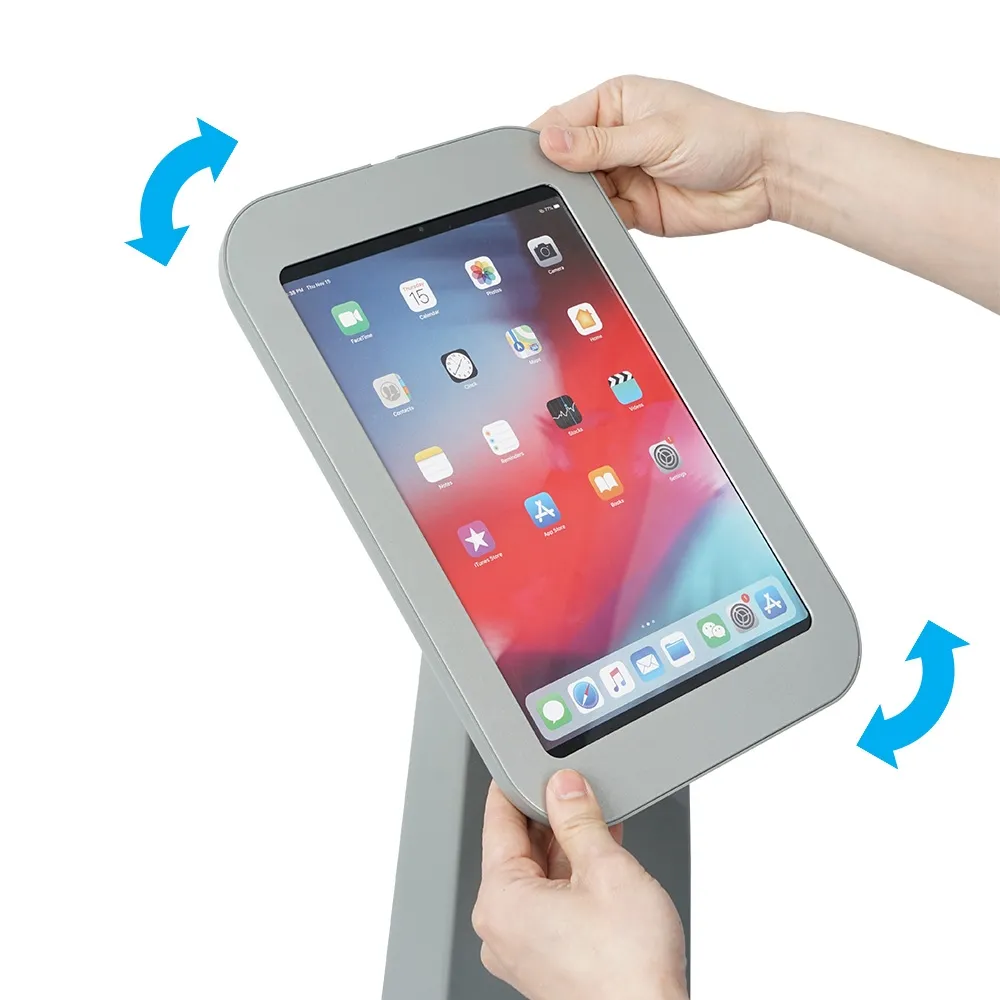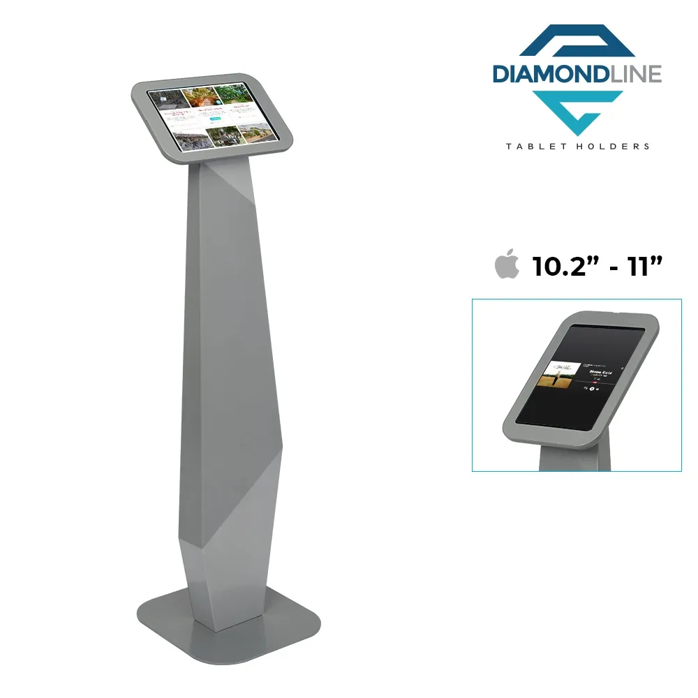 This silver iPad stand is a part of our Diamond Line range, our premium series of tablet holders that have upscale looks at affordable prices. This stand features a geometric patterned center column that really stands out in any location. The tablet mount holds different iPad models: including most iPad, iPad Pro and iPad Air models. This mount is versatile as well, allowing display in both portrait and landscape orientation to meet the needs of different businesses. The home button is exposed to allow users having full access while using this display.