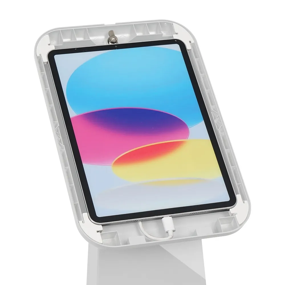 Use a secure iPad kiosk at your business to create an interactive display that is perfect for use as a check-in stand, order taker, promotions, interactive experiences, and more. This fixture is part of our Diamond Line range, a premium set of tablet holders that offers stylish look and robust build at an affordable price. This display is for use with most different iPad devices, (compatible list above). The versatile mount can be placed in either portrait or landscape-oriented orientation depending on your specific needs. The home button is exposed on this display to provide full access to the device.