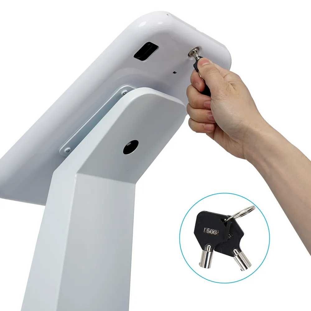 The secure tablet kiosk, like other locking floor standing tablet displays, features a lockable cover that helps to deter theft during use in public areas. The camera is still exposed on this display to allow both facial ID and interactive experiences to take place. Internal cable management threads the device power cord through the centre column and out of the back of the stand through a small hole, maintaining a professional appearance at all times. The 1200mm height makes the tablet accessible for users of different size.