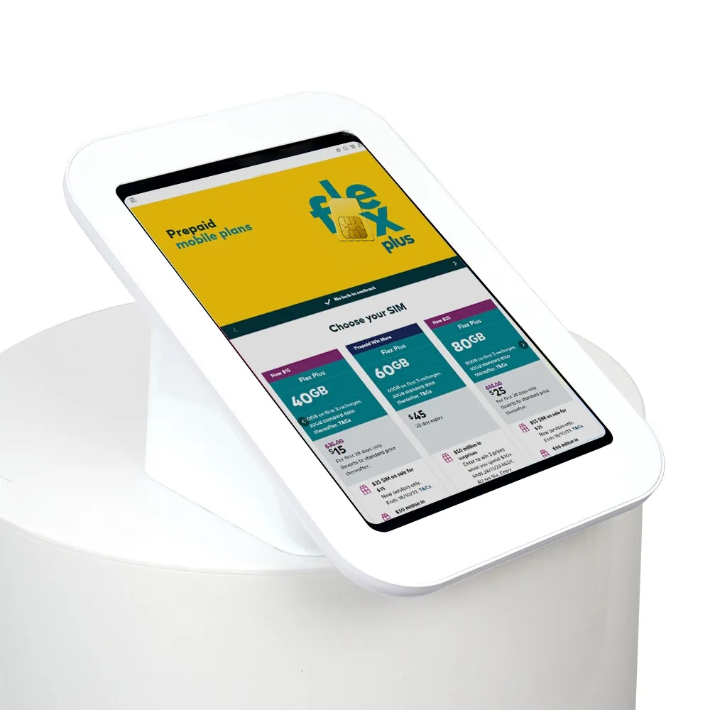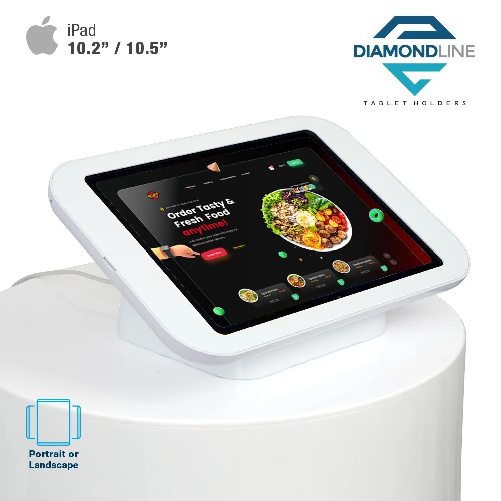 This locking tablet holder, iPad security stand features a lock on the back of the mount to prevent theft whilst in use of public areas. The included keys gives employees easy access to the device when needed and allows access to the home button if needing to make changes. The home button is exposed on this display to provide full access to the device. The camera is still exposed on this display to allow both facial ID and interactive experiences to take place. A Kensington lock slot on the rear of display allows for the cable lock, sold separately, to be attached to the entire display as an extra security measure.