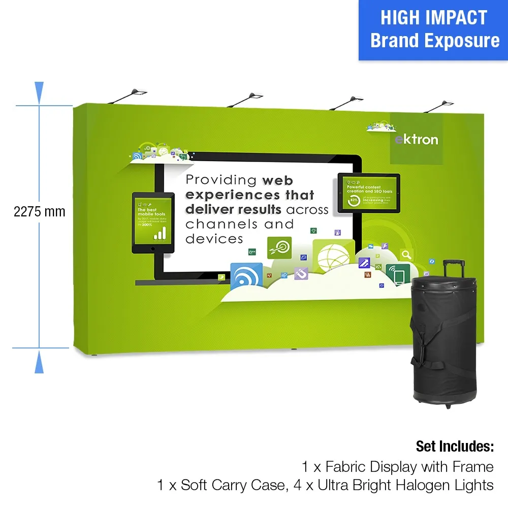 The exhibit displays, exhibition stands use a dye-sublimation process to digitally print onto the fabric for true, vivid colours of your designs. Set- up takes around 5 minutes without any tools needed for the portable custom stand. The whole kit breaks down small to fit within the included carry case for easy transport to and from different events. You can also optionally purchase (4) halogen lights that attach to the top of display for added effect, highlighting your graphic and further drawing attention to the stand!