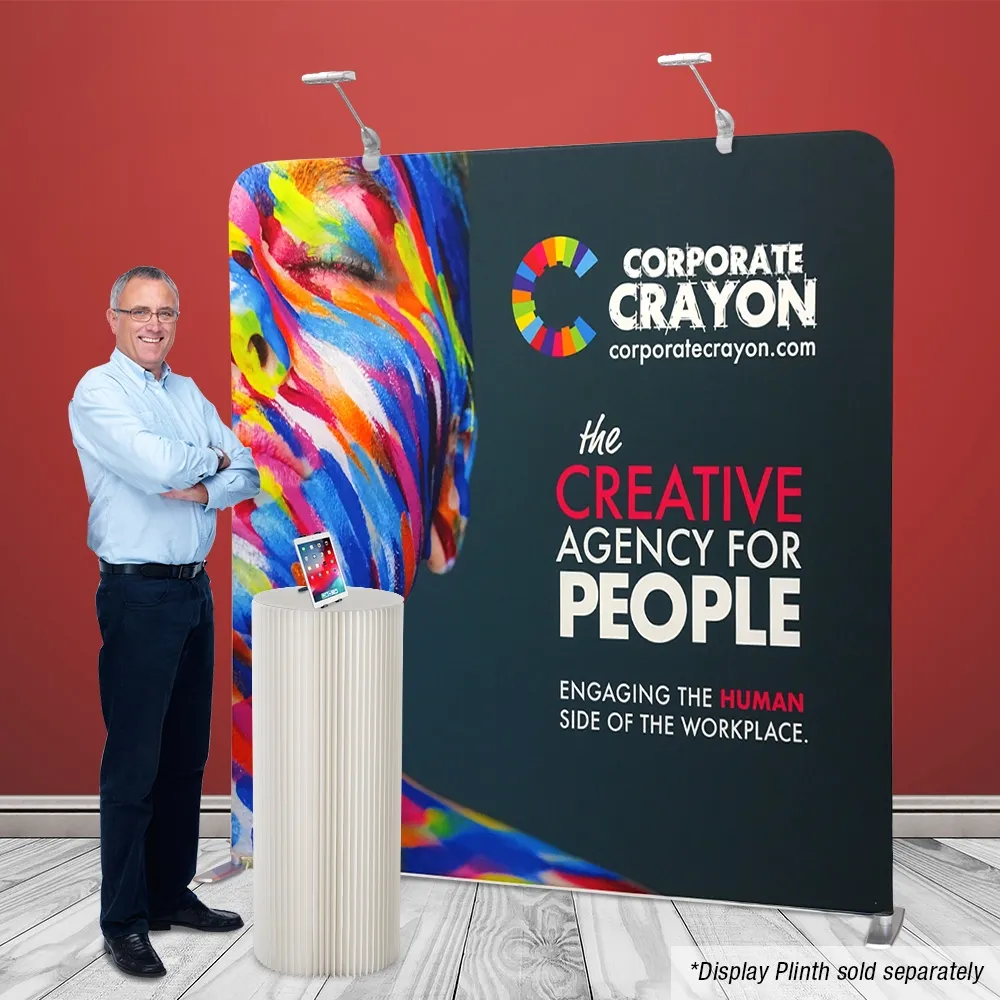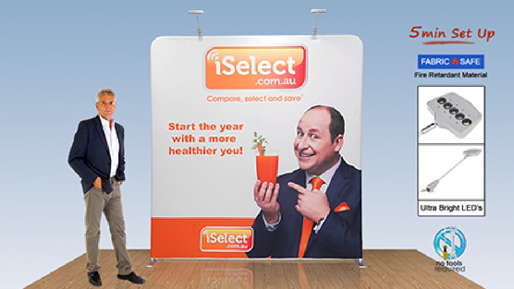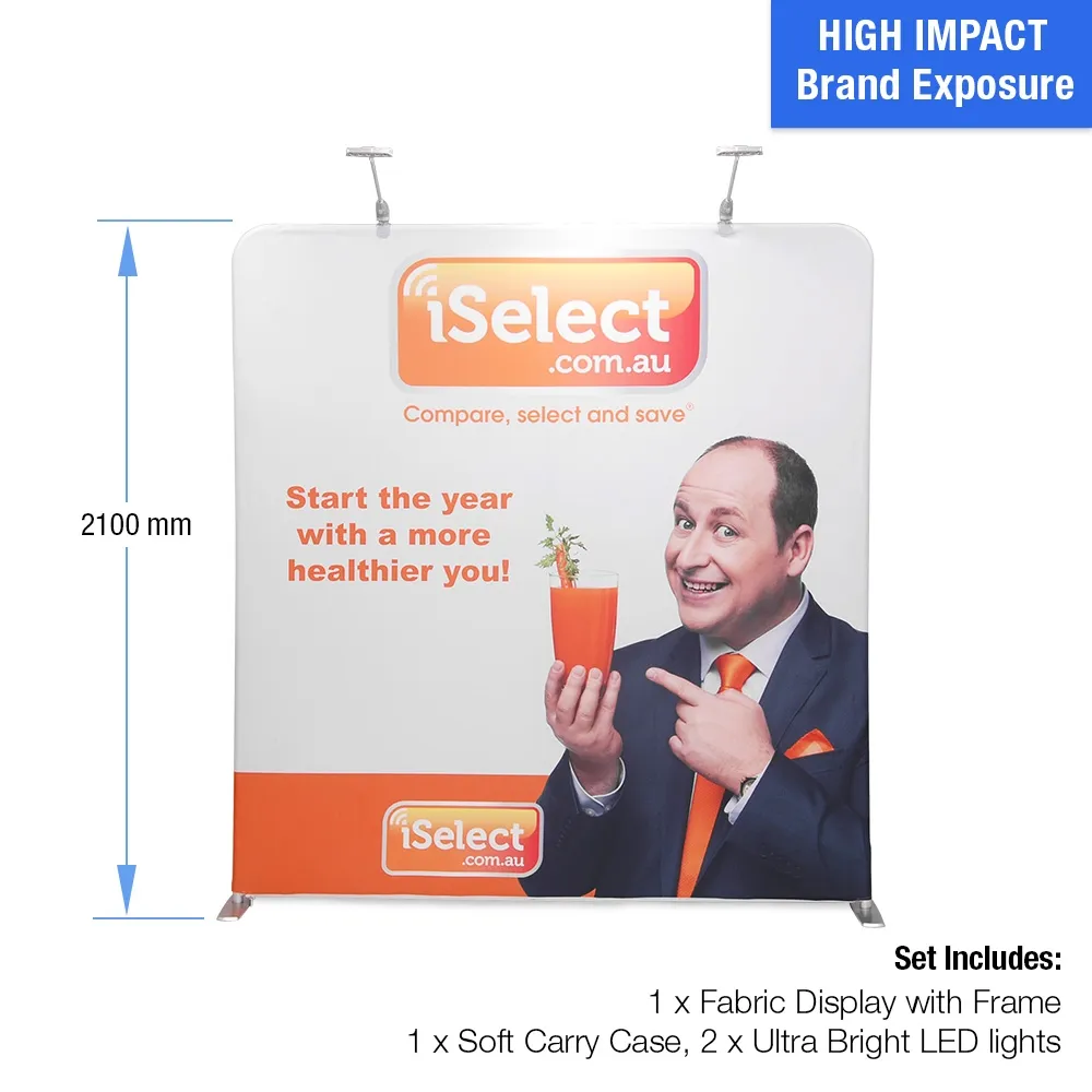 This backdrop banner, also known as exhibition stand, have your custom graphics digitally printed onto the flame retardant polyester fabric using a dye-sublimation process, ensuring full colour and vivid imagery. This fabric is also machine washable to keep the exhibit display looking fresh at all events. The lightweight aluminium frame ensures durability for long-lasting use as well. This kit includes (2) LED lights that help to illuminate the portable trade show displays and really pop out to potential clients!