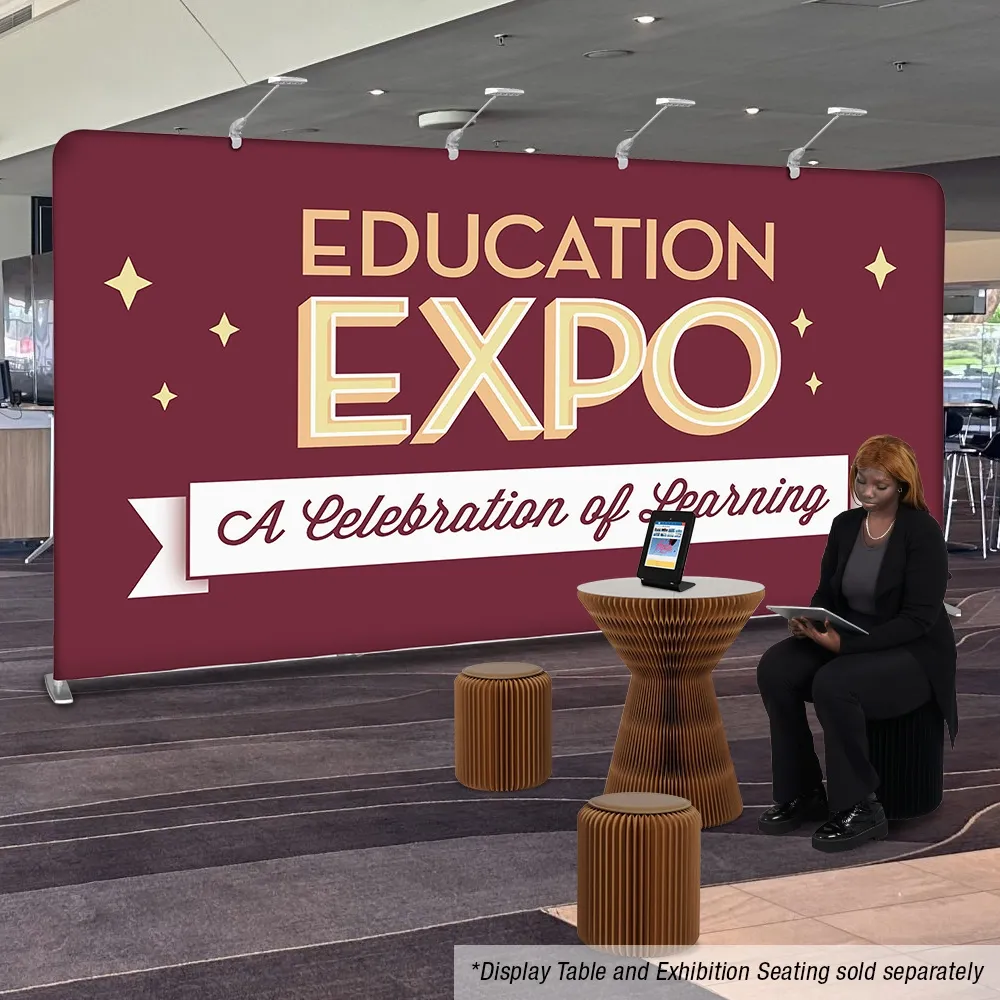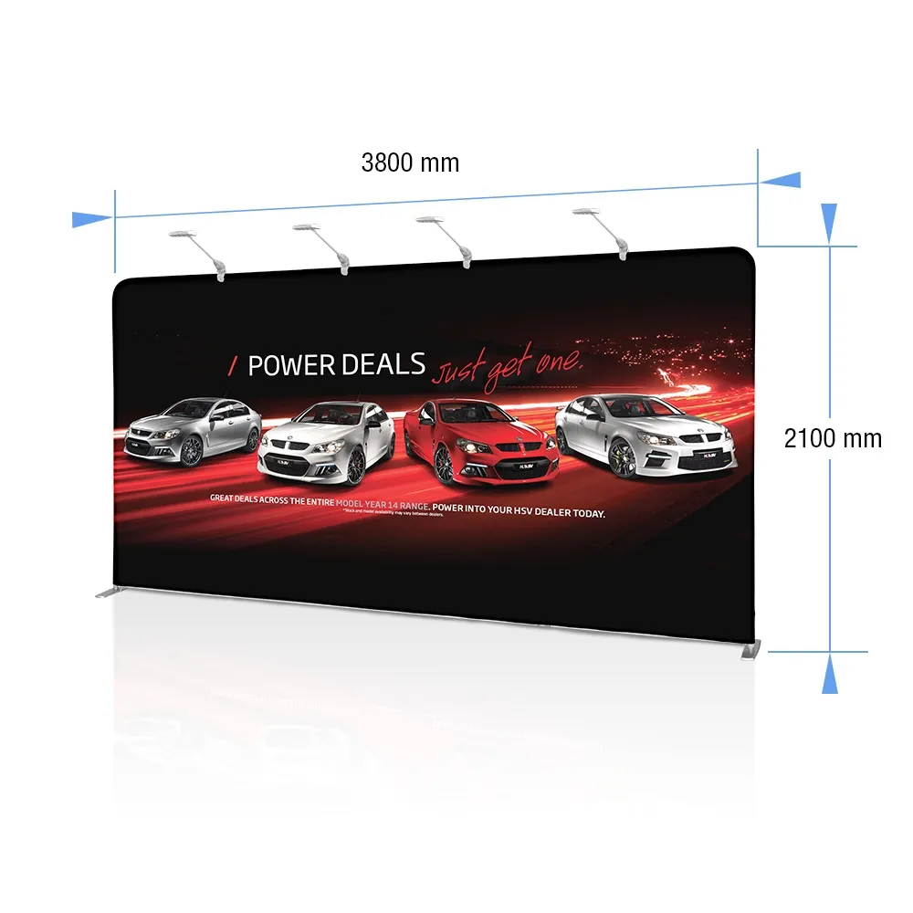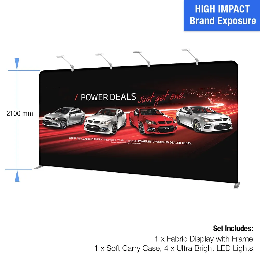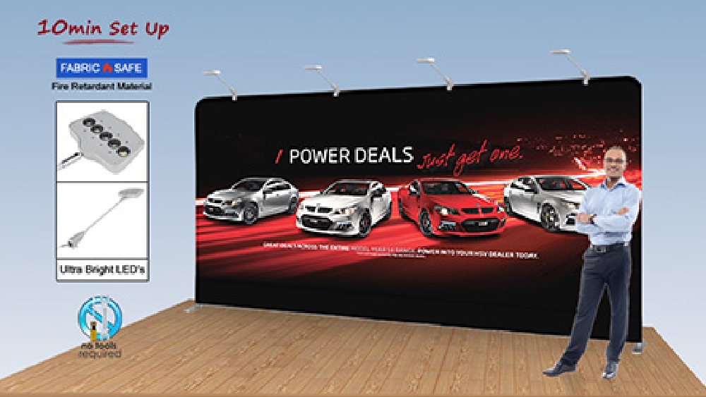 Exhibition pop up displays, custom booth stands and printed backdrops are wide displays that are great in booths or as a back drop at many different events. Custom designs are digitally printed using a dye-sublimation process that provides true colours and accurate depictions of designs with vivid imagery. Our in house team is available for design help ass well, with different tiers of assistance based on your exact needs. The machine washable polyester fabric is easy to clean if it gets dirty whilst in use, and the material is flame retardant for added safety. There are LED lights included for atop the media back drop, with the (4) lamps able to illuminate different sections of the graphic to really stand out and gets passersby attention!