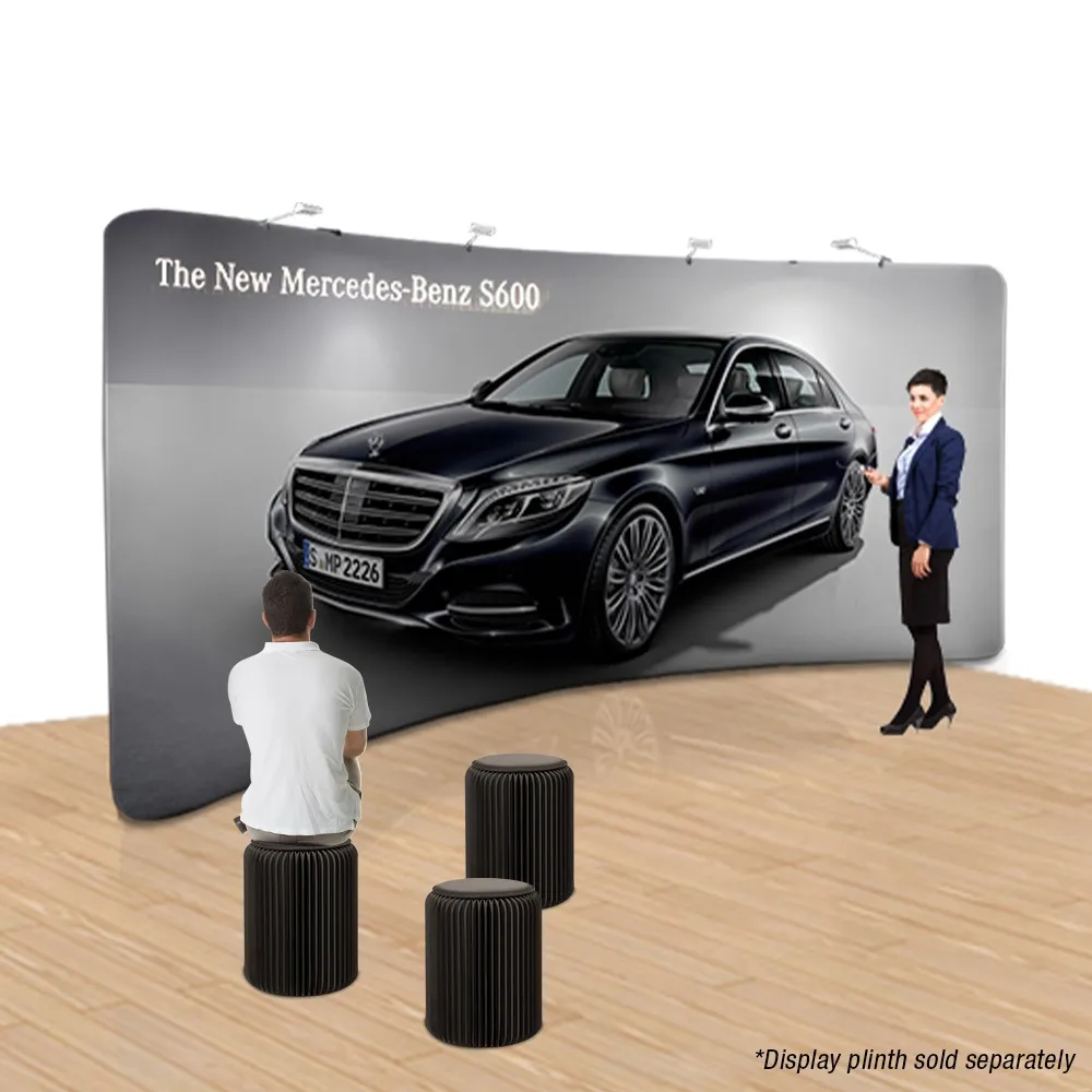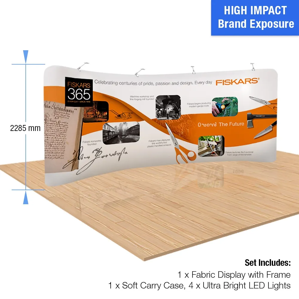 The backdrop banner, like exhibition displays and pop up kits, have your custom graphics digitally printed in full colour using a dye-sublimation process that offers a true depiction of designs with rich imagery and vivid colours. Our in house team is available for design assistance if needed as well, with three different tier options to choose from to help you find the right choice that meets your specific needs. There are LED lights included as well that illuminate the display to help better draw attention, with the lights at the end of extended arms for easier positioning. The fabric is made from stretch polyester and is flame retardant and machine washable, with a zipper that closes the wrap around the frame for a seamless design.