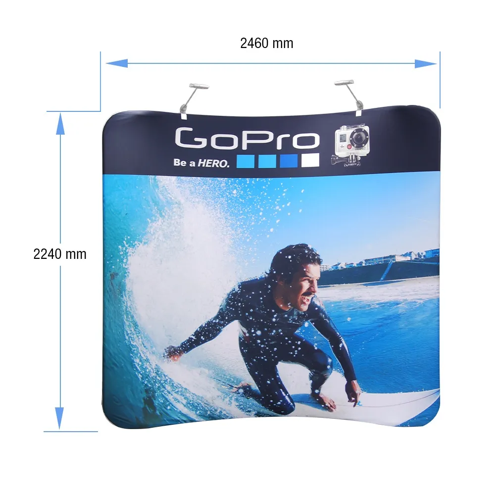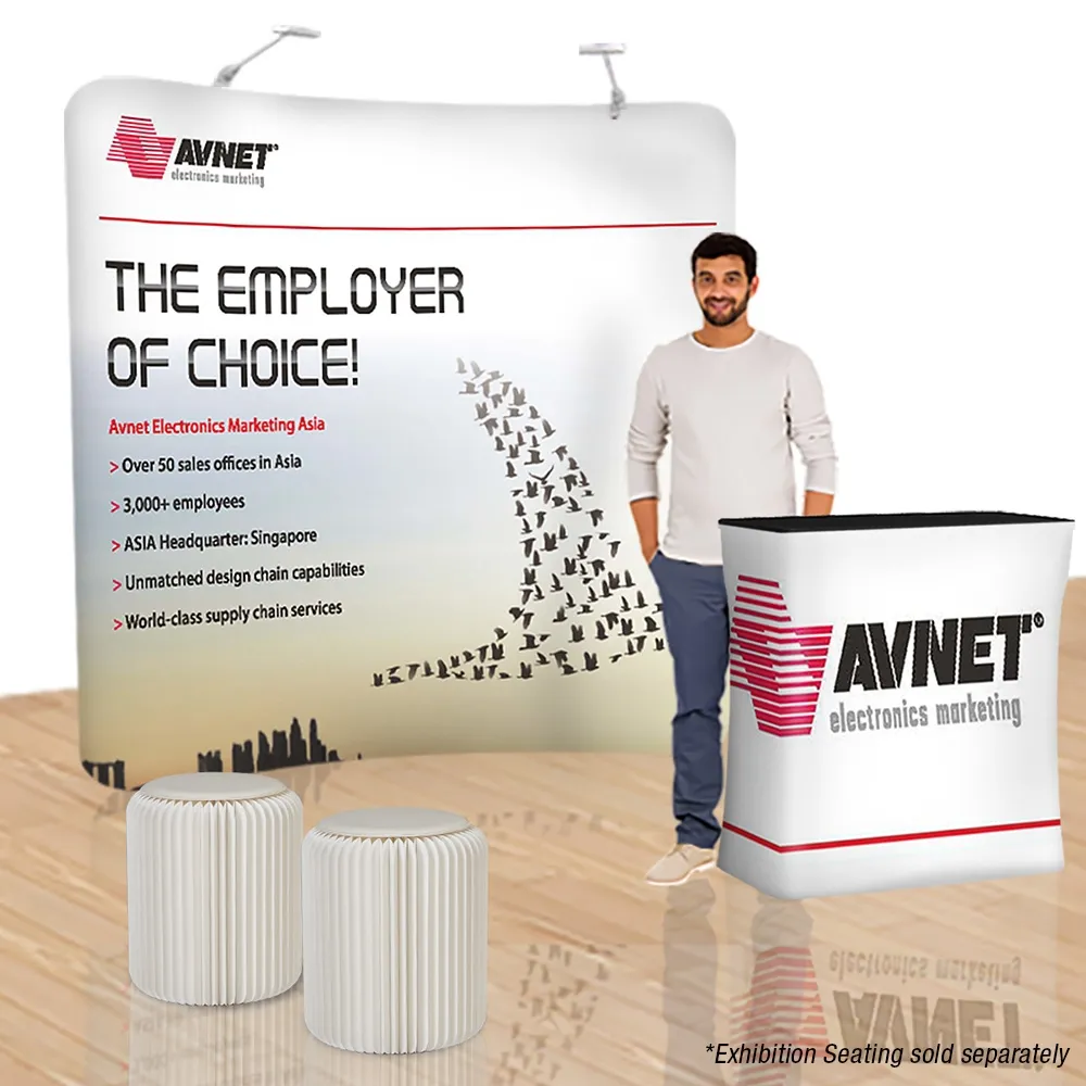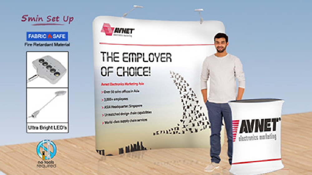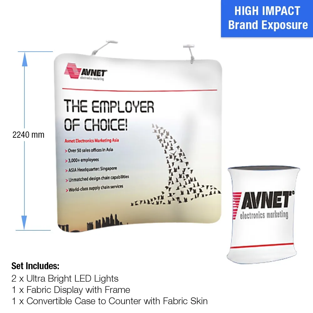 An exhibition display stand, like fabric expo displays, has custom designs digitally printed onto polyester fabric wraps using dye-sublimation for vivid full colours that don't fade. The polyester fabric is made from flame retardant and machine washable materials for safety. The wraps zip around both the main backdrop as well as the greeting counter to offer a complete kit! There are also (2) LED lamps available that attach to the top of the stands to illuminate the popup and draw further attention towards your booth!