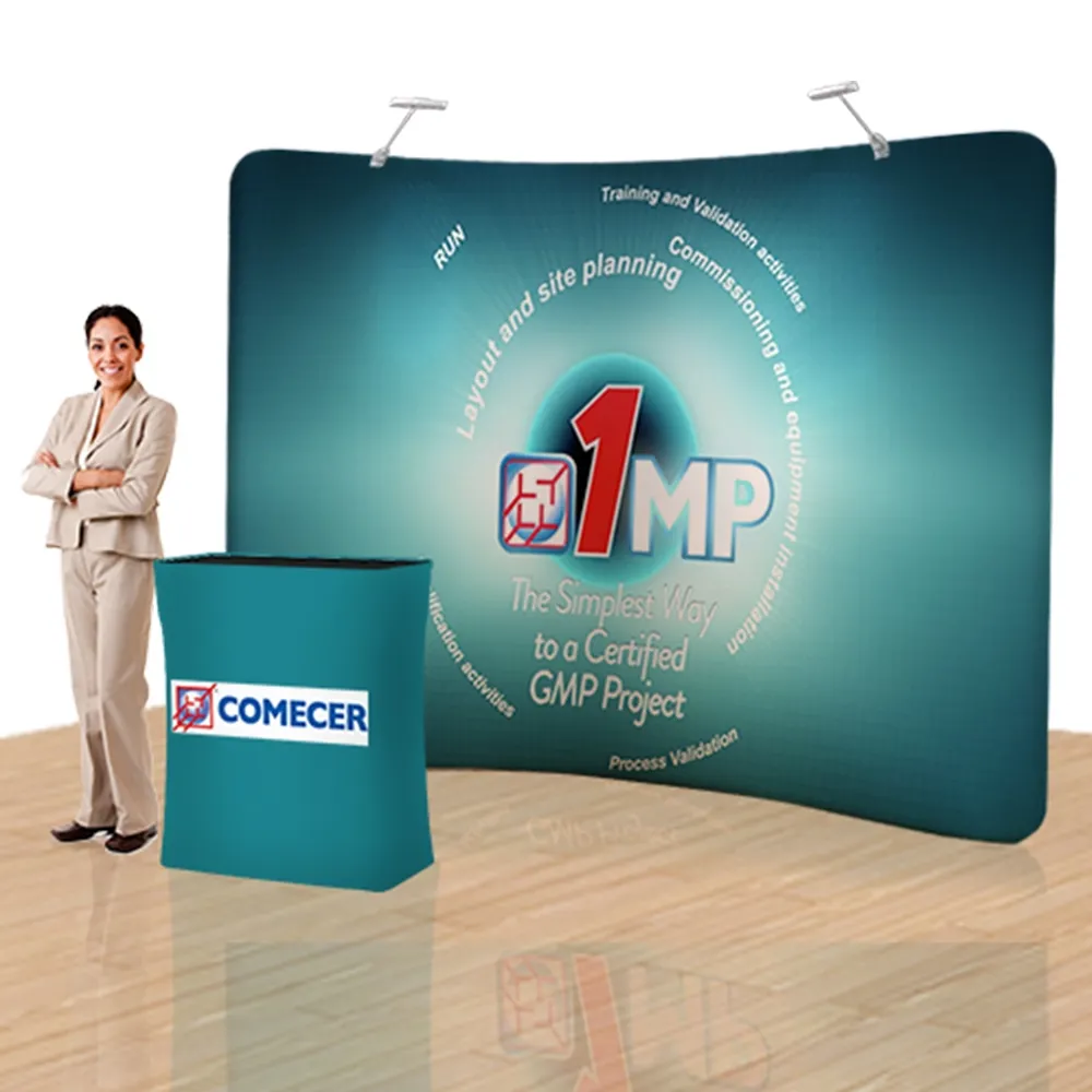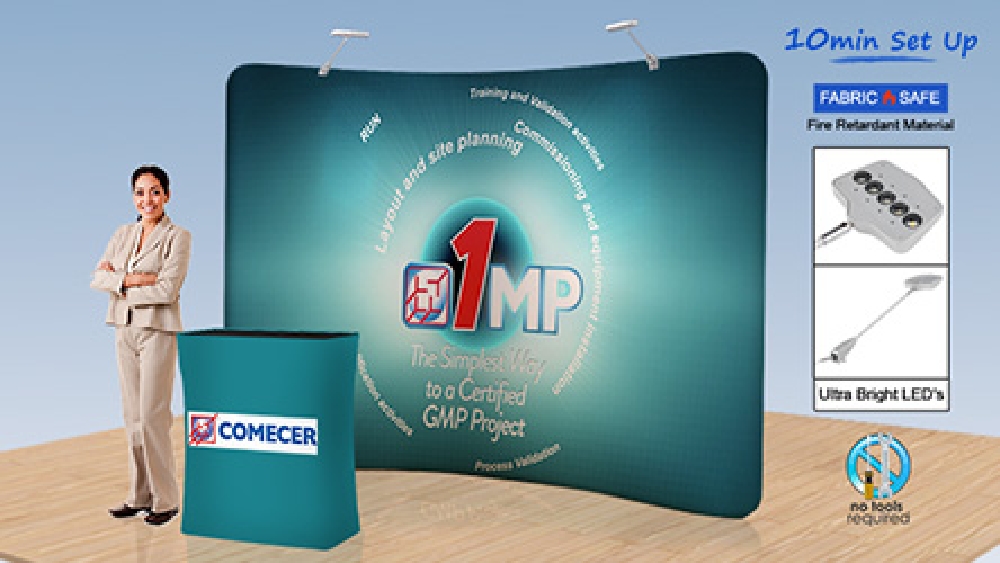 • Trade show displays include greeting counter with fabric wrap that features custom printing