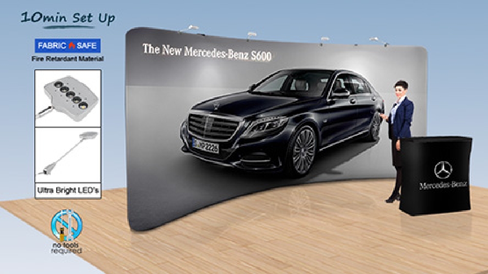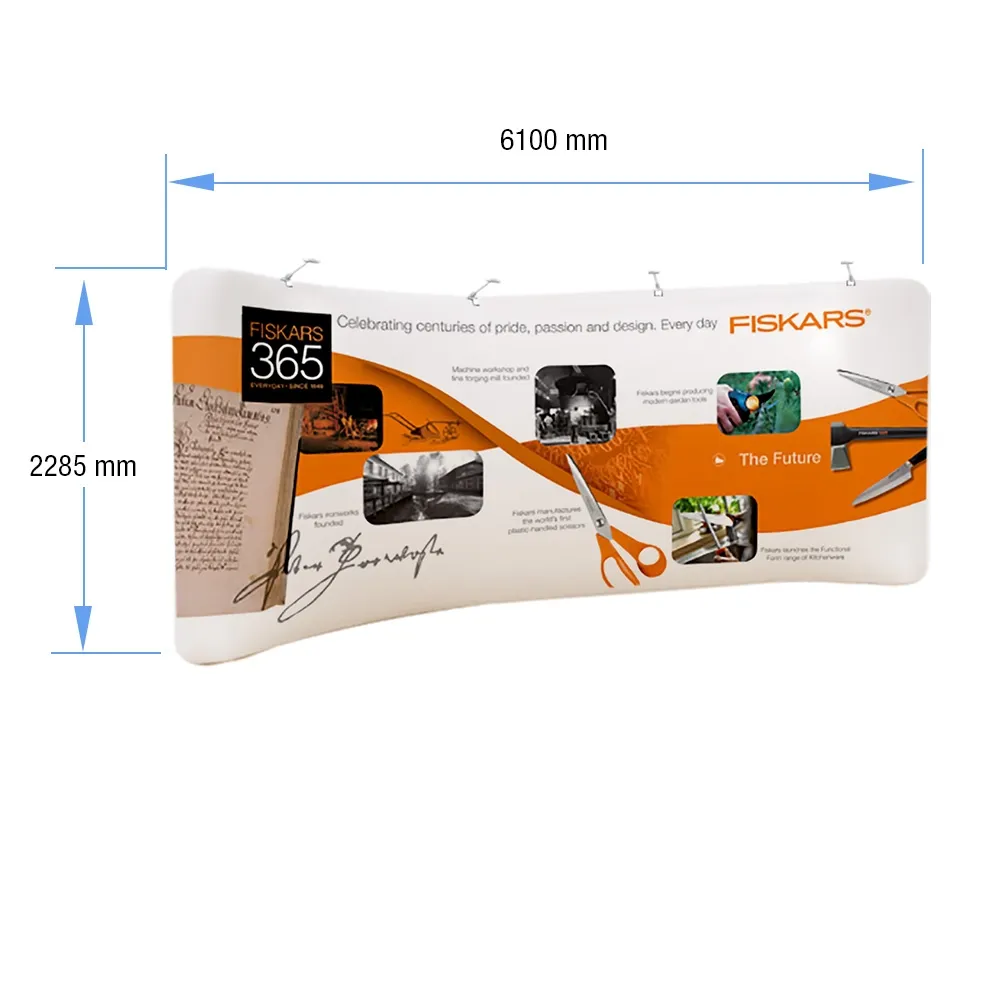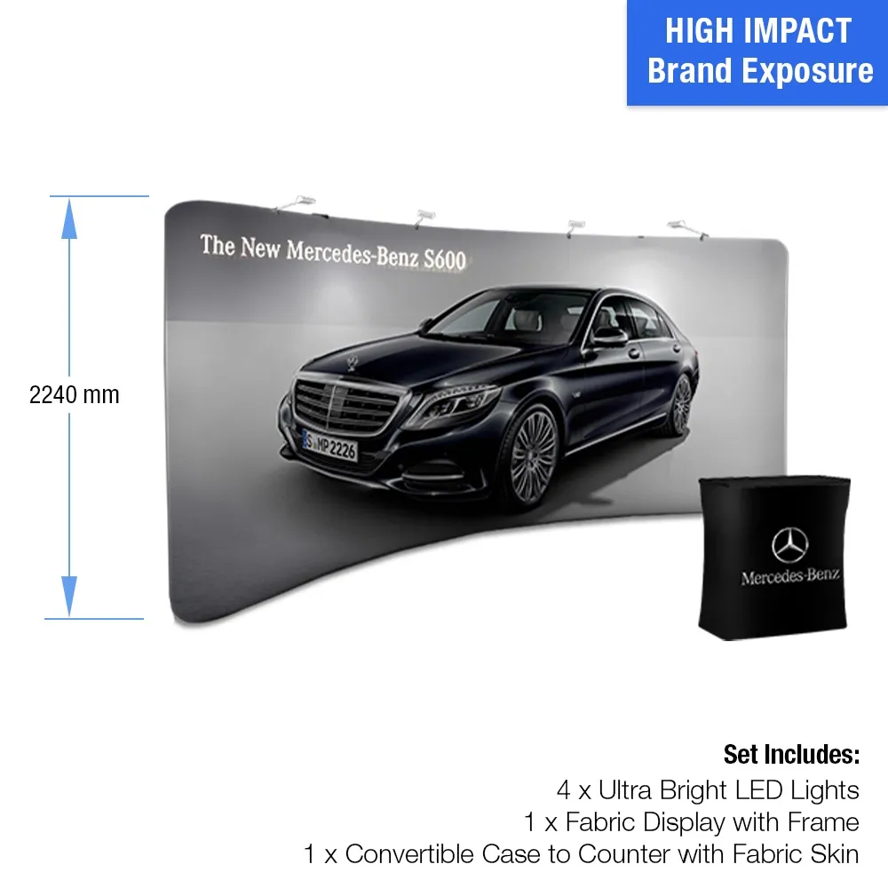 The large pop up displays are 2.2 x 6.1m, ideal for a backdrop at any event. The curved aluminium frame sets up in less than 10 minutes without any tools required, letting employees focus on other tasks at hand. The polyester fabric wraps are made from flame retardant and machine washable materials to ensure long-lasting use as well as safety. This display exhibition stand, like portable popup booths, also have (4) LED lights included in the kit that can be placed across the top of the stand to light up the graphic. This portable display has (2) carrying bags included as well to make transport to and from events an easy task. Order today for fast delivery so you can use this popup fabric kit at your next event!