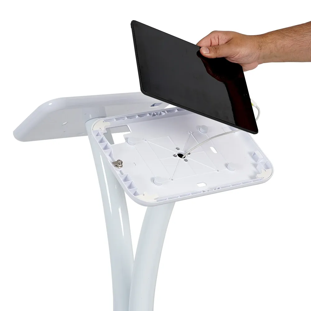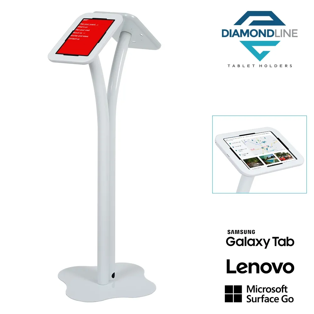 Use this tablet floor stand holder at restaurants, reception areas, cafes, retail stores, shopping centers, waiting rooms, and more to make it easy for visitors to check in, order from your menu, or even learn product information. The universal bracket mounts works with most Samsung Galaxy, Lenovo, and Microsoft Surface Go tablet models. These versatile mounts allow for display in both landscape and portrait format, ensuring your app will be shown in the correct orientation. Facial ID and interactive experiences are possible as the cameras are exposed on devices.