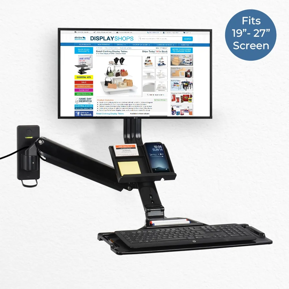 The sit stand work station has integrated cable management to help maintain a tidy display. A plastic clip at the back of where the monitor goes helps to corral the cords, and they are then guided along the arms with black plastic clips that also help keep them out of sight. Installation hardware is included for set-up on most wall types, though you should check with a local professional if unsure they are appropriate for your intended use. Slimline Warehouse offers same day shipping to anywhere in Australia with this and most other in stock products if purchased by 3pm AEST, buy online today for quick dispatch to your location!