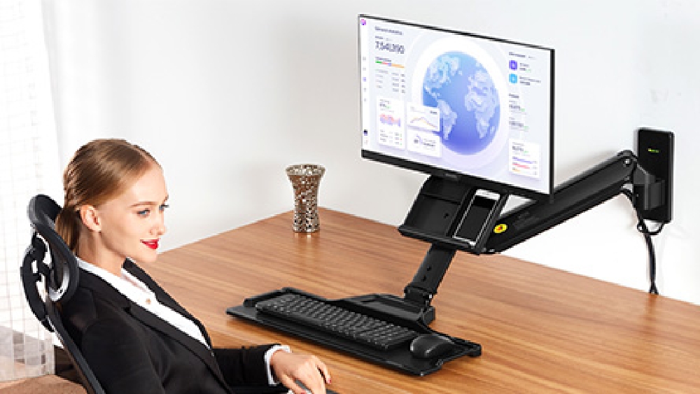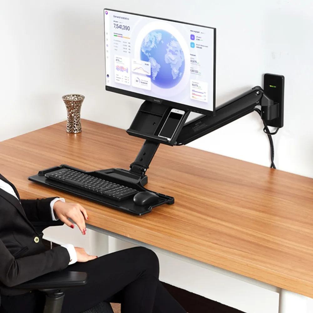 A sit stand desk, wall mount workstation has (2) shelves attached for various uses. The larger 560 x 200mm tray is perfect for holding a keyboard and mouse, with a smaller shelf at the back for placing pens, phones, and more. Attached to the arm is an angled holder with different compartments to hold various desk accessories and also can hold a phone to be comfortably seen whilst working. The keyboard tray extends out from the arm up to 60mm and can fold up when not in use, with a twist lock on the bottom to make sure it can't inadvertently be moved. This ergonomic mount helps reduce neck strain and is great for use in hospitals, offices, retail stores, information centres, clinics, customer service areas, and more.