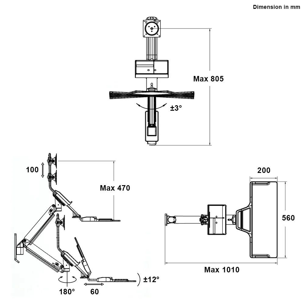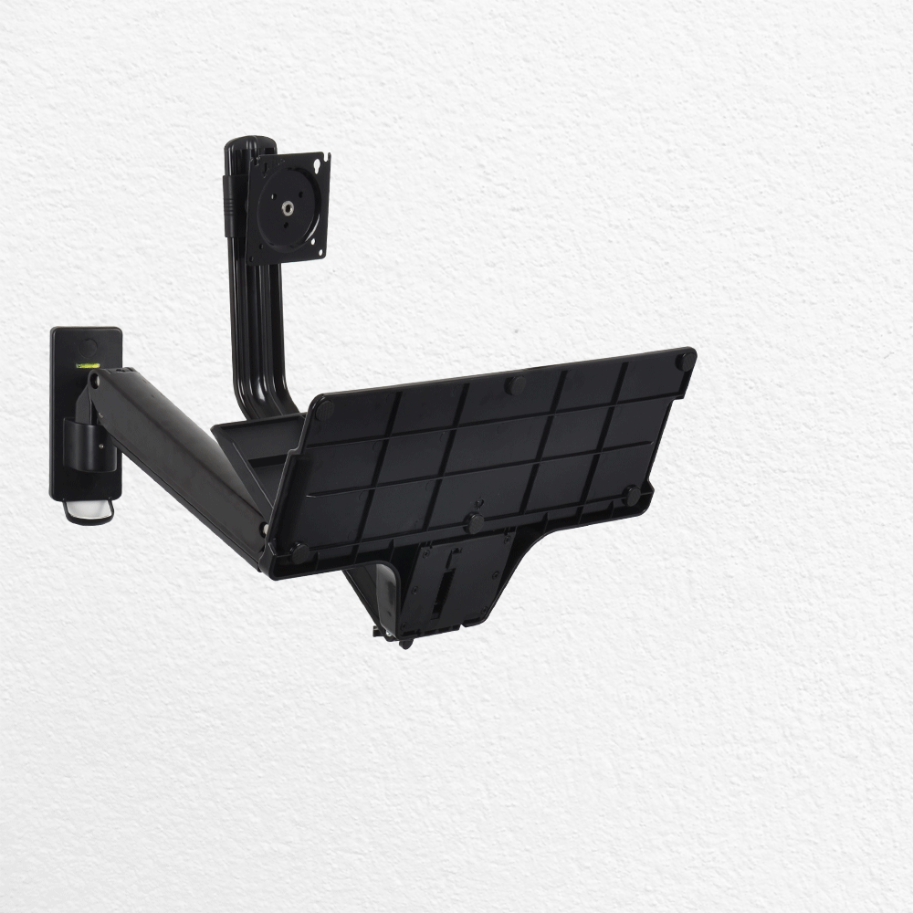 • Wall mount workstation has articulating arms to position screen up to 805mm from mount!