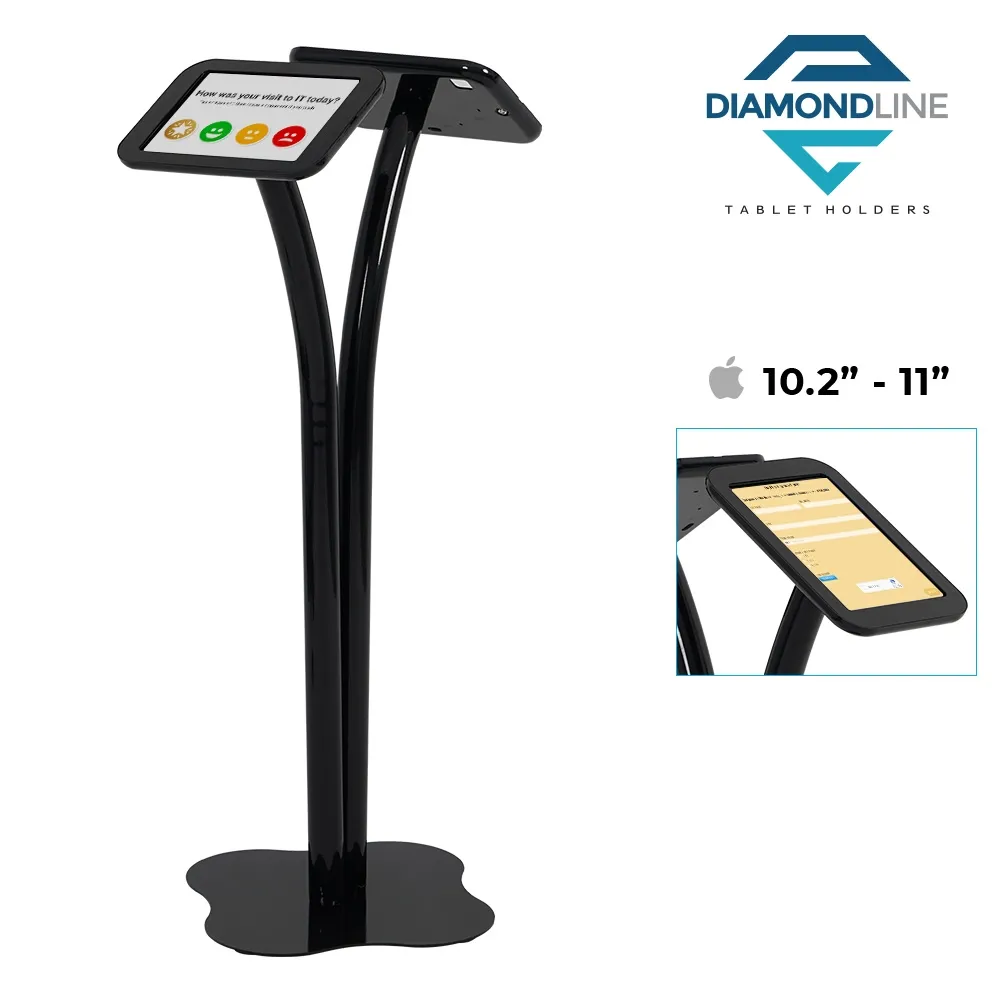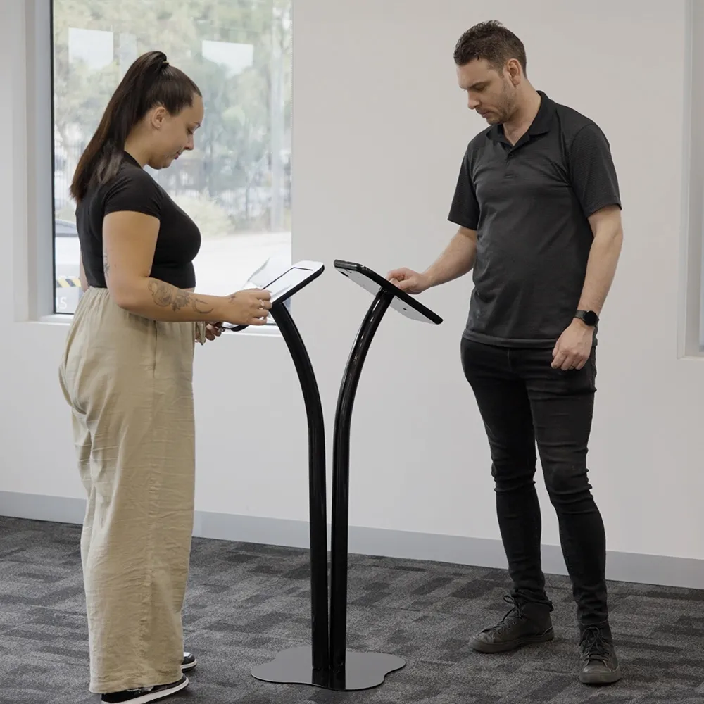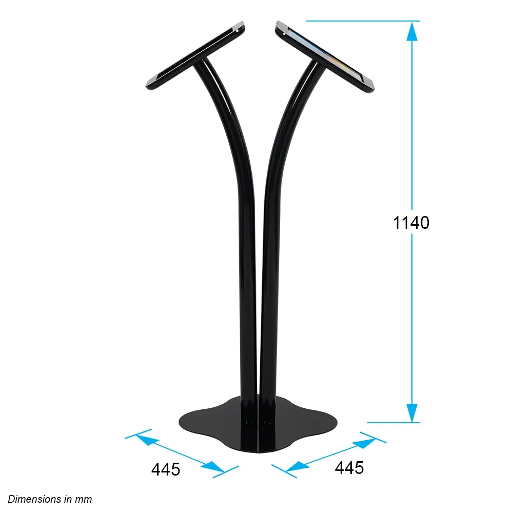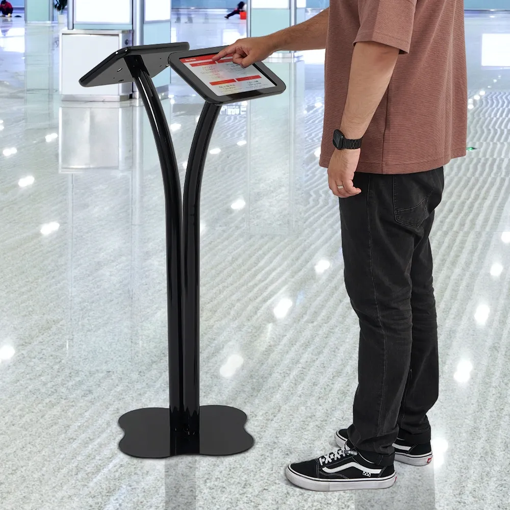 The tablet enclosure stand, like other freestanding iPad holders, is a lockable display for use in public spaces with little worry of theft, allowing employees to not have to keep it watchful eye on the stand. There are (2) mounts on this display for a freestanding unit that maximises your space and gives multiple people the opportunity to use the tablets at the same time. This display features internal cable management that keeps the power cord from the display hidden from you, and is accessible by a small cutout in the bottom of the centre pole. The European style display has a curved centre pole with an angled mount for a sleek look that makes it easier for users of various types to interact with your tablet.