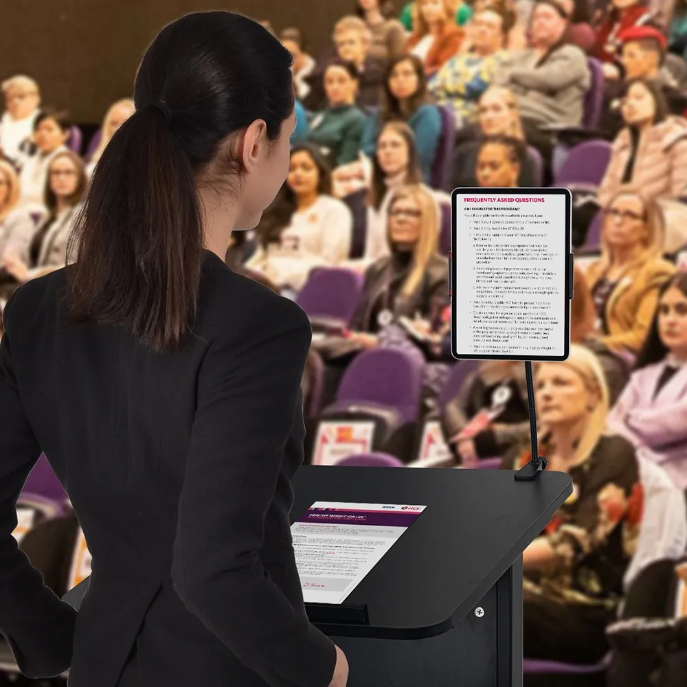 A podium with wheels makes it easy to move the lectern into position for different presentations, or have a single rostrum in an area that can be quickly moved between rooms! The 1180mm tall wood lectern includes a clamp on tablet holder to have phones or tablets in the view of speakers whilst speaking to the audience. The holder has a a 350mm long flexible gooseneck that can be positioned where needed for each individual. The clamp securely attaches to the top surface without any tools needed, and can quickly be removed if it will not be utilised.