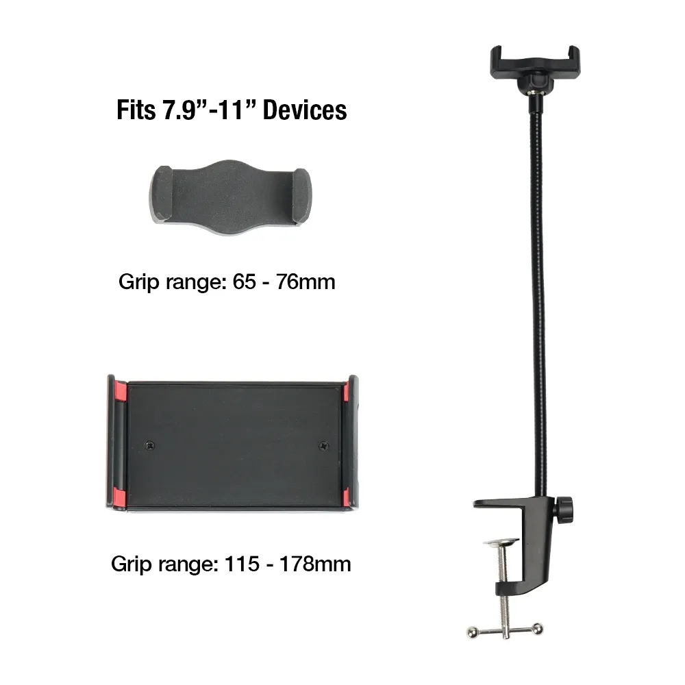 • Tablet holder uses gooseneck design to make positioning iPads & tablets easy
