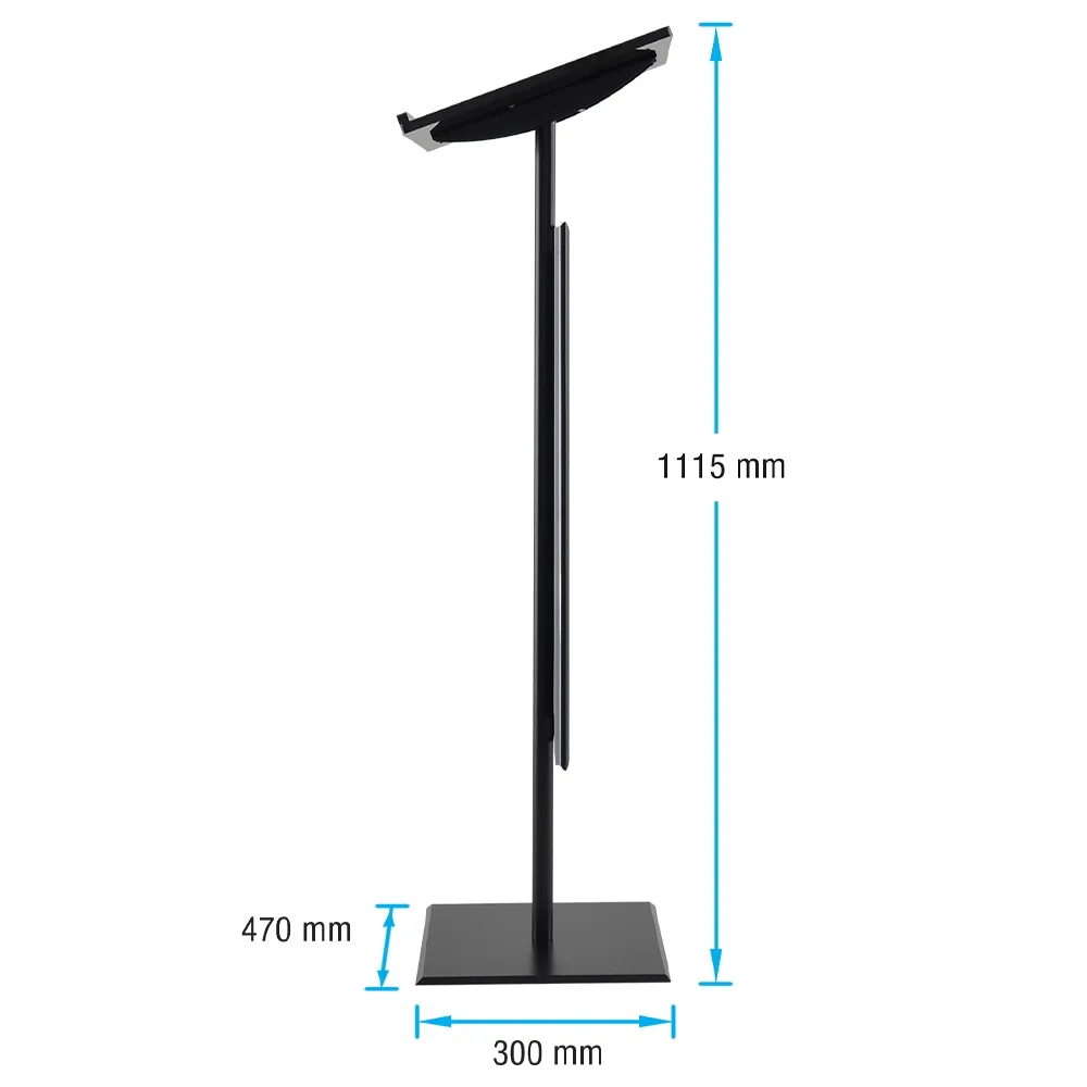 This speaking pulpit, black lectern has a protective PET lens as well to keep graphics looking great whilst on display. The large 470 x 320mm acrylic lectern top easily holds tablets, laptop, and other lecture materials for a speaker to refer to, and is 12mm thick for an impressive look. The raised lip keeps items from sliding off, with the slight angle making it easier to read off of whilst giving a presentation. Overall the stand is 1115mm tall to easily accommodate a wide range of speaker heights.