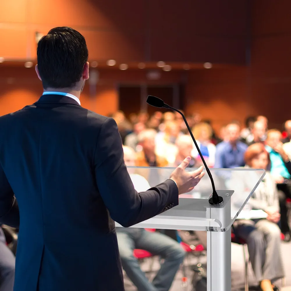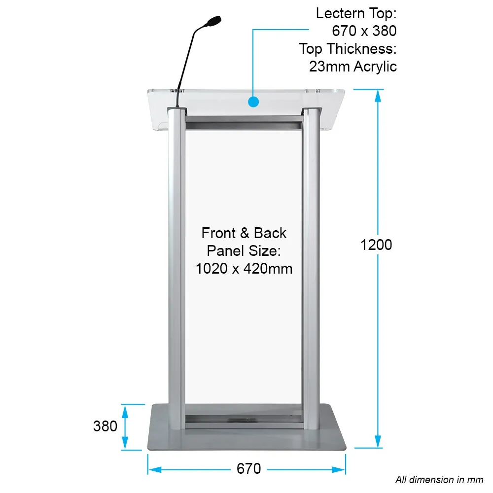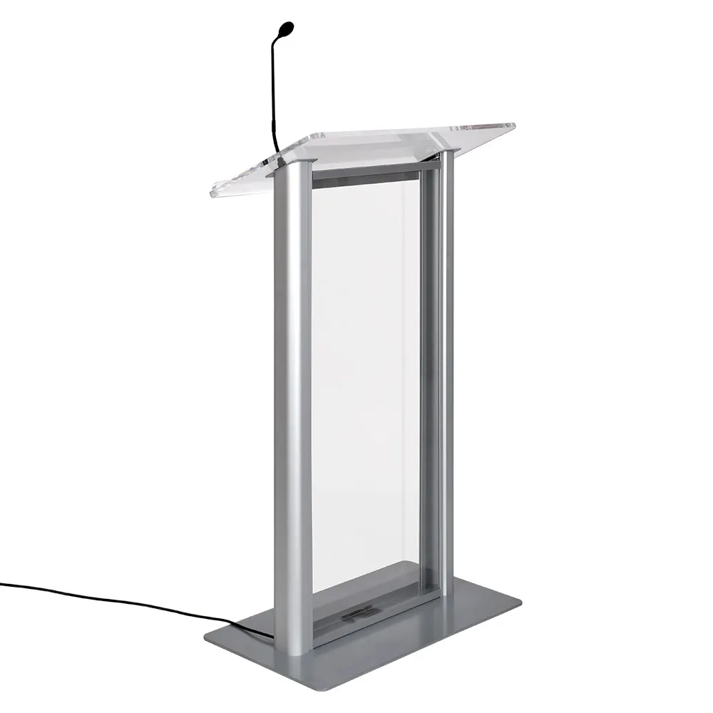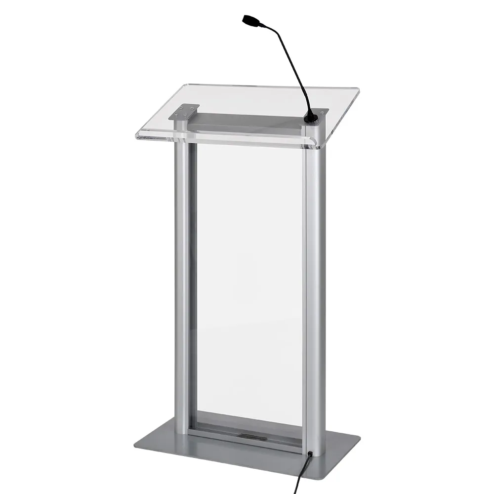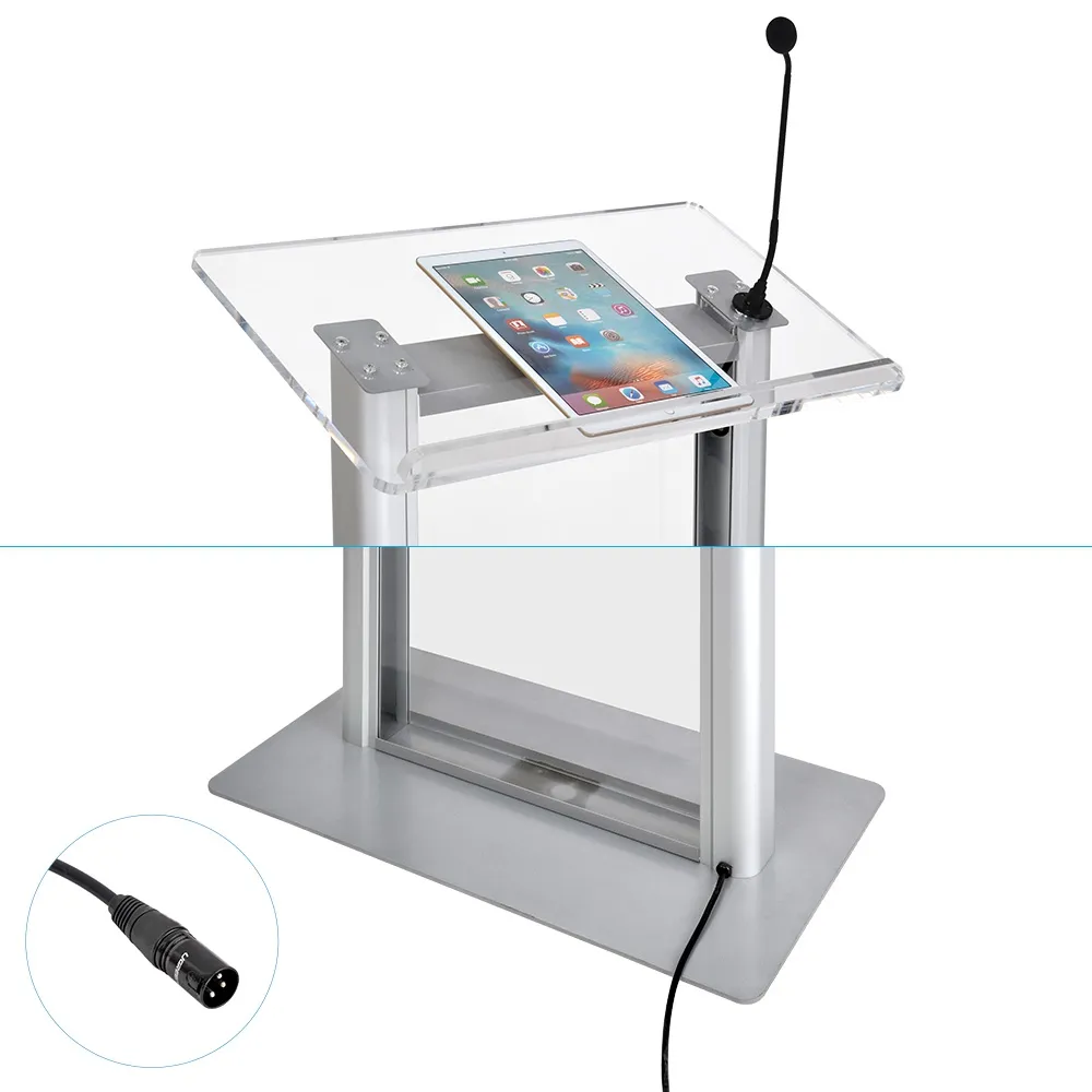 This podium with built in microphone is perfect for presenters to speak from at any event. The lectern and mic uses a combination of two different materials for a stylish and professional looks that helps to get the attention of the audience in different settings. The base and supporting frame are made of metal with a silver finish for a modern, striking look to draw the eyes of an audience. The top tabletop is made from 23mm thick clear acrylic, perfectly complementing the silver supports.