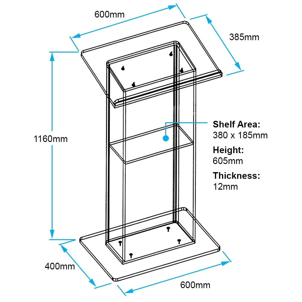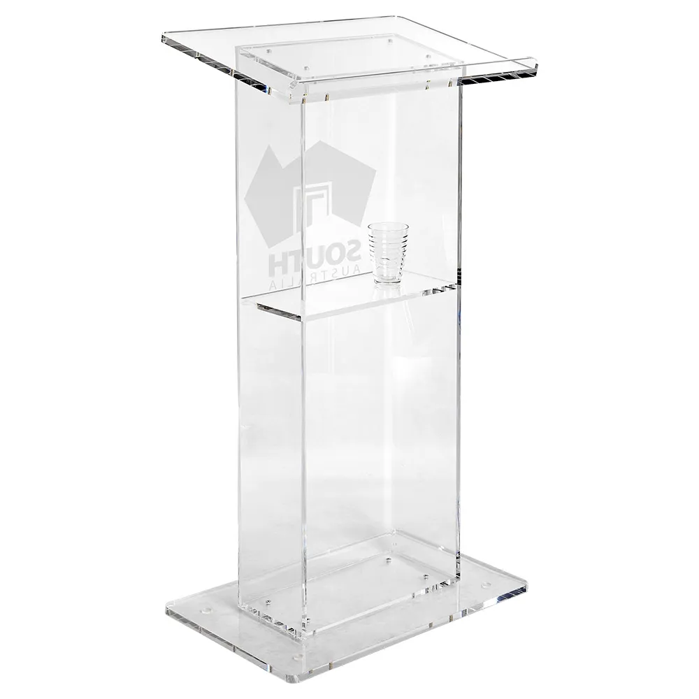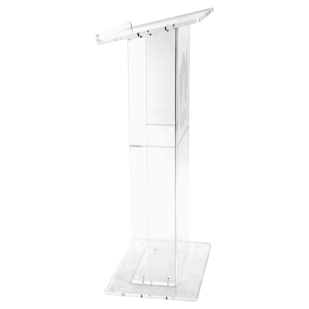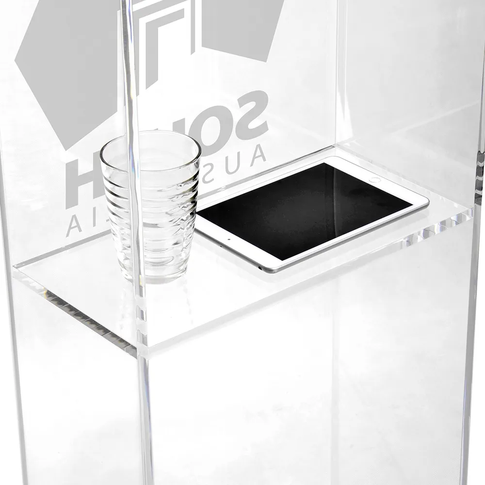 - 12mm thick clear acrylic podium features polished edges, with appeal of glass at lower cost!