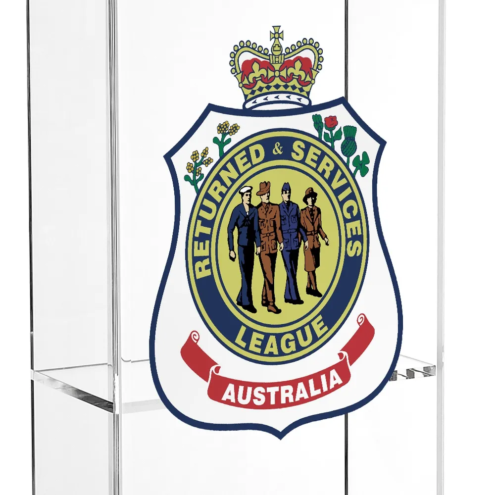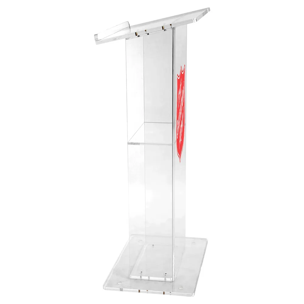 The custom podium is a great way to custom brand a podium with a creative design. Plot cut graphics up to 350 x 550mm are laminated to the front of the lectern. Incorporating the CMYK graphic with the clear acrylic lectern creates an intriguing design that adds an upscale look to any location. This lectern with logo helps keep your location or company in mind during a presentation from any speaker.