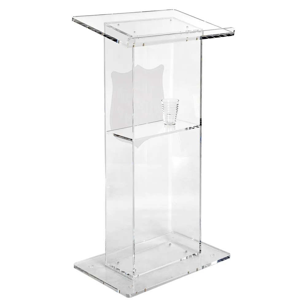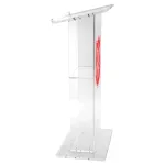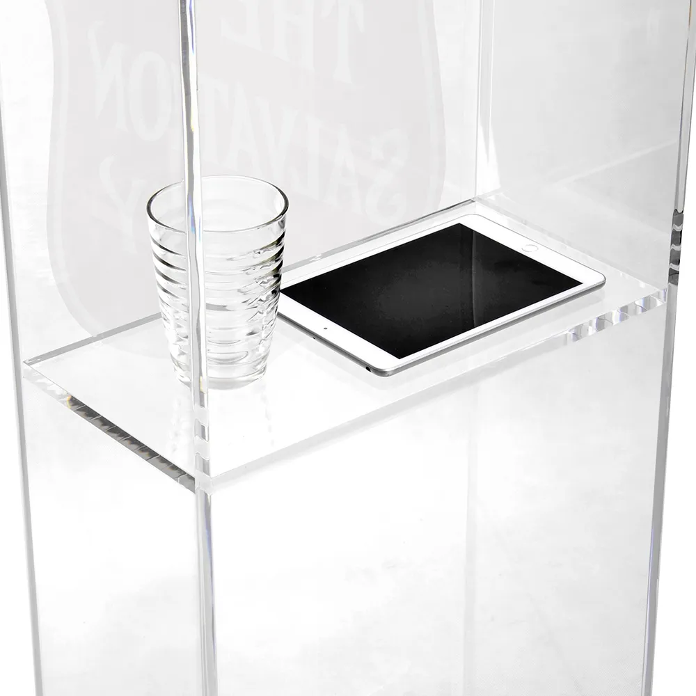 This custom podium, also known as an acrylic lectern, features a 12mm thick clear acrylic build. Polished acrylic adds an upscale look similar to glass with far less weight and more durability. The weighted base adds stability to the lectern, with floors prevented from damage thanks to rubber feet on the bottom. Whether for a church, conference centre, university, or exhibition hall, this lectern is sure to fit in anywhere.