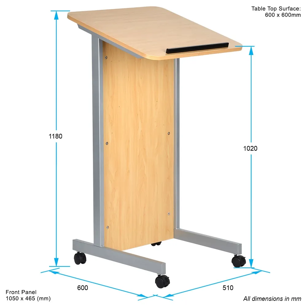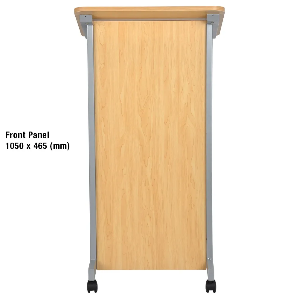 - Rolling lectern has locking wheels for easy movement & stability when in place