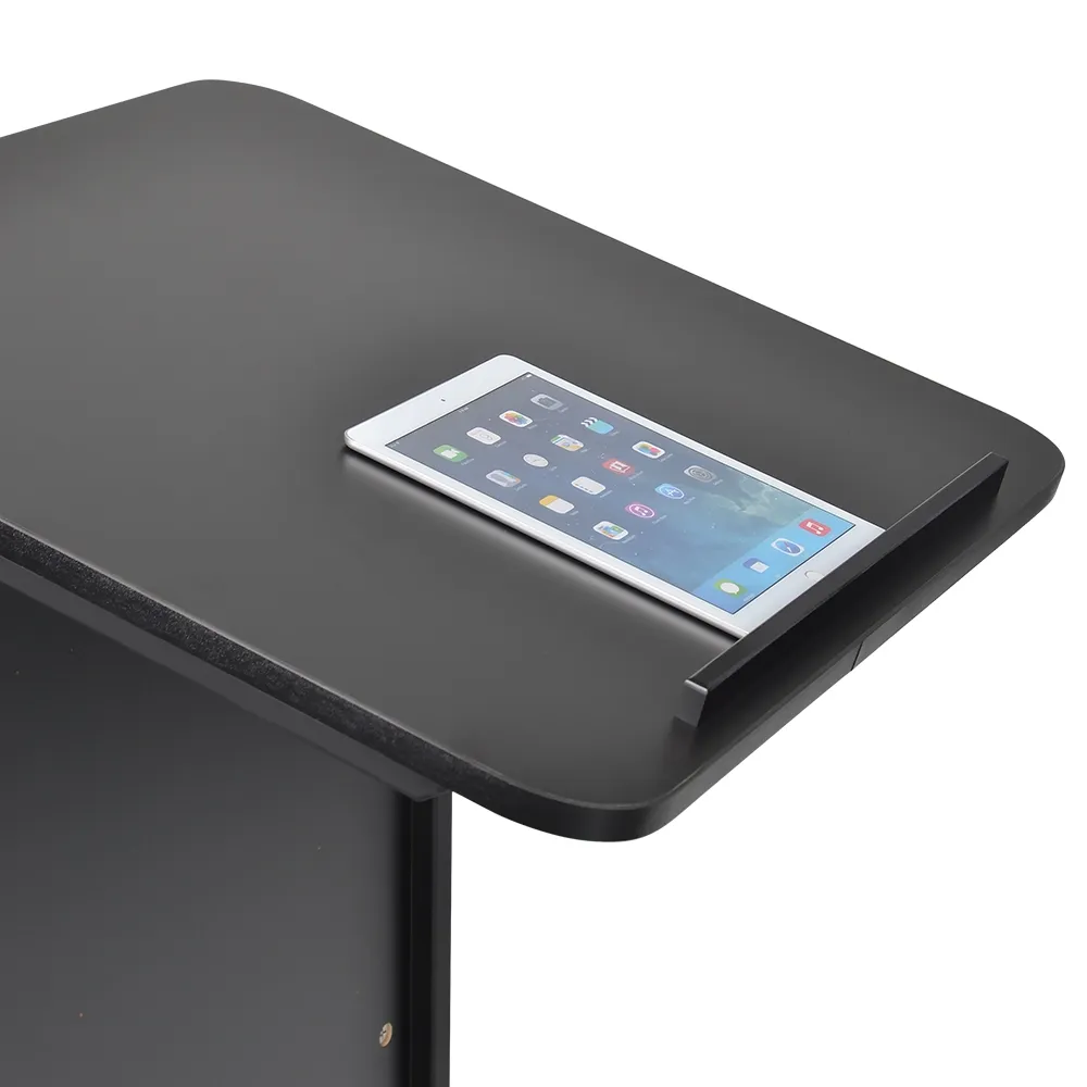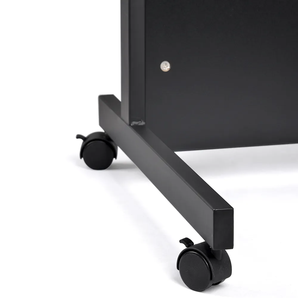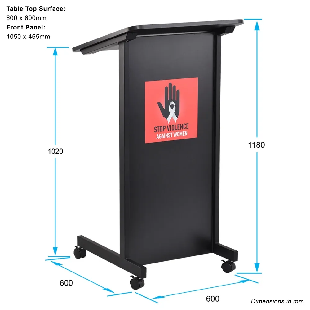 The freestanding podium, wheeled lectern is easy to position around a conference centre, trade show hall, school, office, and more thanks to the castors on the base. Each of these wheels swivels and can be locked, ensuring stability of the mobile podium once in a desired position. The 600 x 510mmm base has a "U" shape to allow speakers to stand directly behind it without issue. The lecture stand top is 600 x 600mm and angled down to allow easy reading of notes, books, tablets, laptops and more. All these items are kept in place by a 20mm tall raised lip on the bottom, preventing them from slipping off.