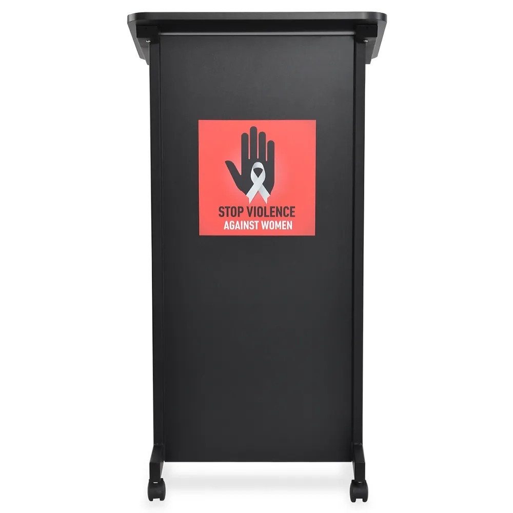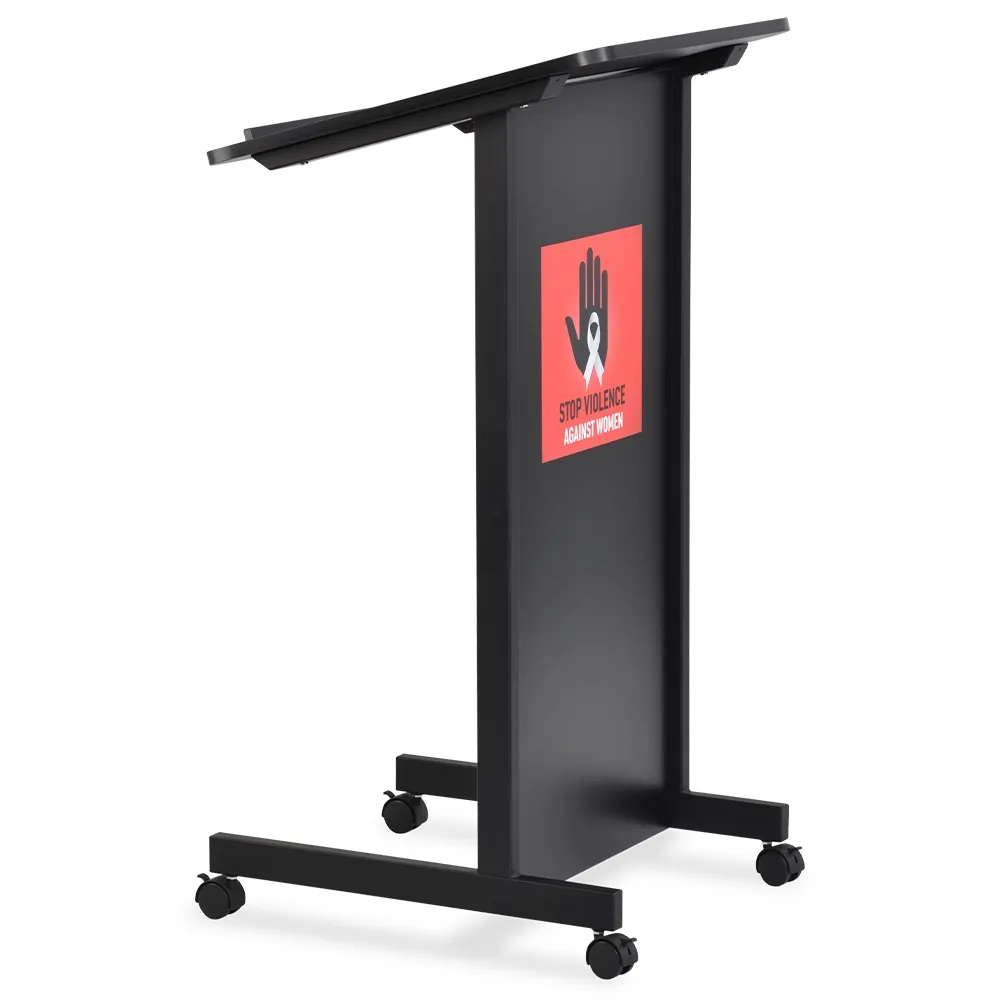 This wheeled lectern is branded on the front to effectively communicate your venue to the audience during all presentations! The custom lectern has up to a 350 x 550mm poster digitally printed in full CMYK colour to effectively match your design. The vinyl graphic is adhered to the front face 100mm down and centred (unless otherwise specified), effectively branding the podium and keeping the audience keenly aware of the venue or event they are attending!