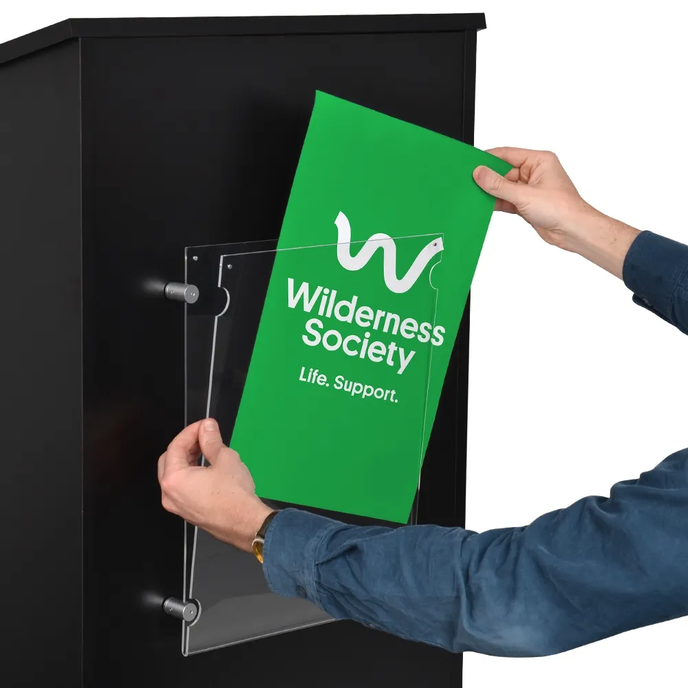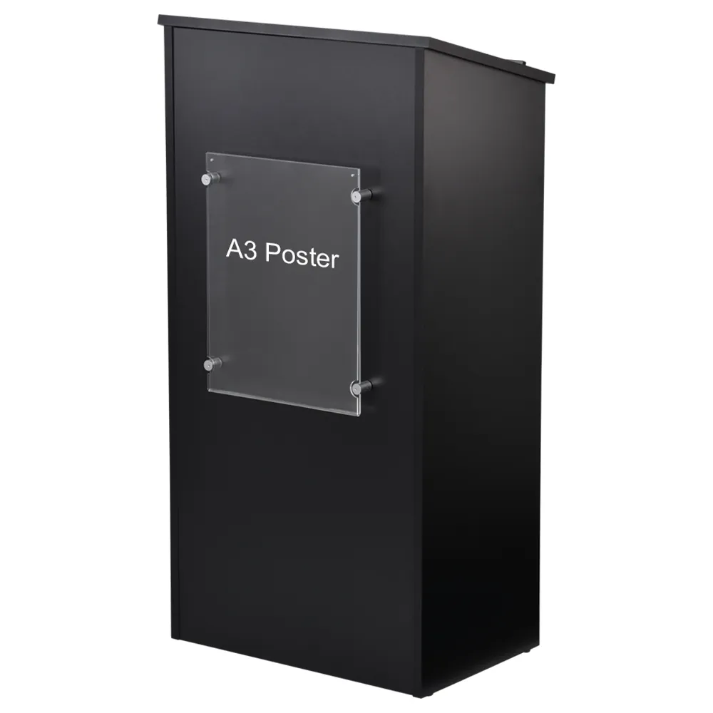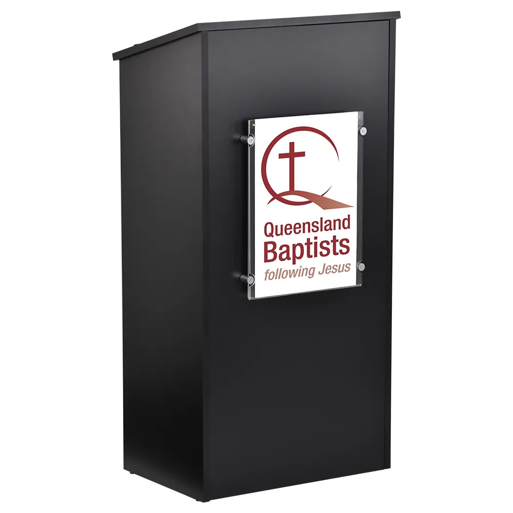 This modern church lectern is great for a number of other locations, including trade show halls, universities, conference centres, and hotel meeting rooms! The contemporary pulpits has a clear acrylic pocket attached to the front face using satin silver edge grip stand-offs. This signage holder is designed for A3 (297 x 420mm) graphics in portrait orientation, with a slide-in design that requires no tools for quick graphic change-outs in seconds!